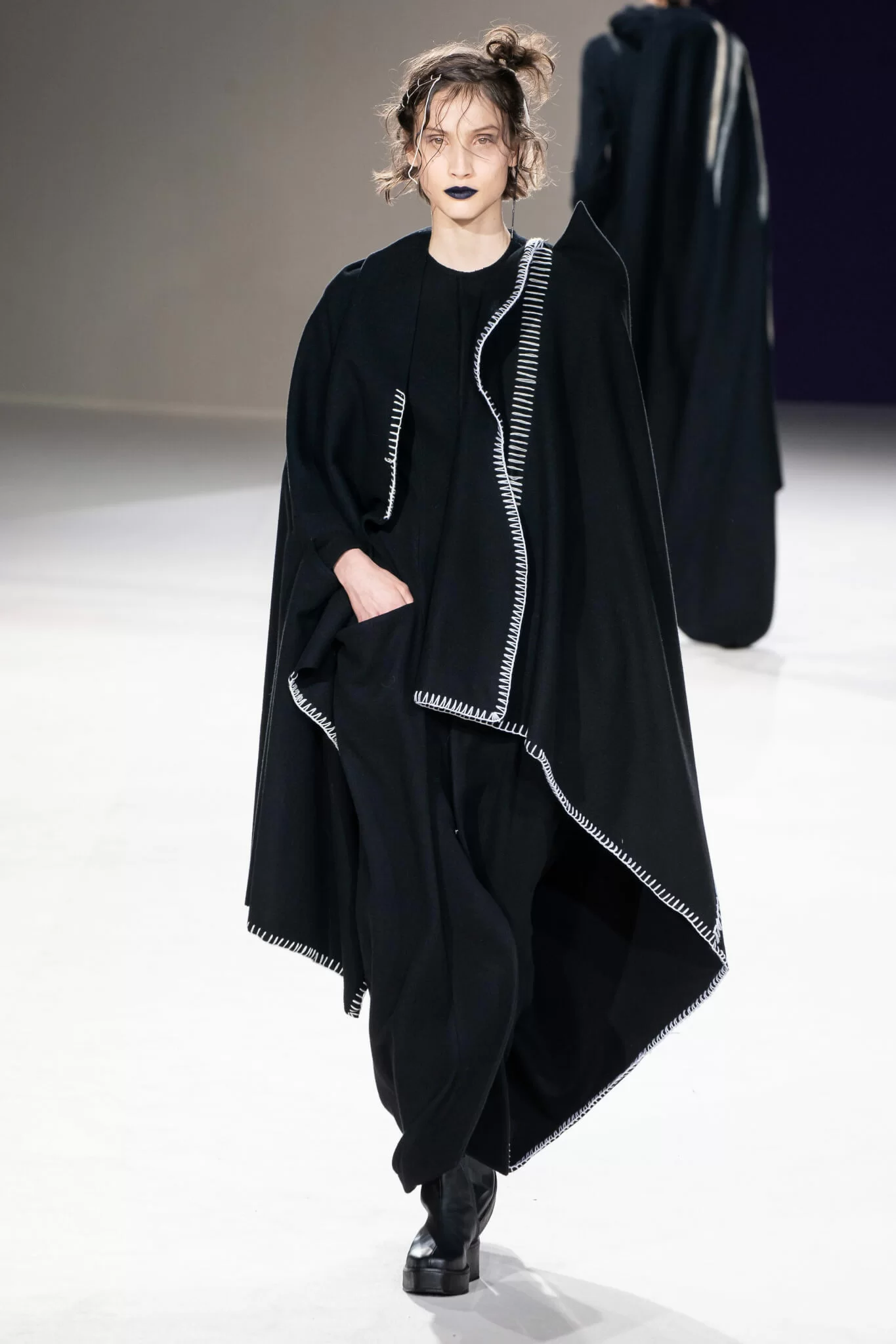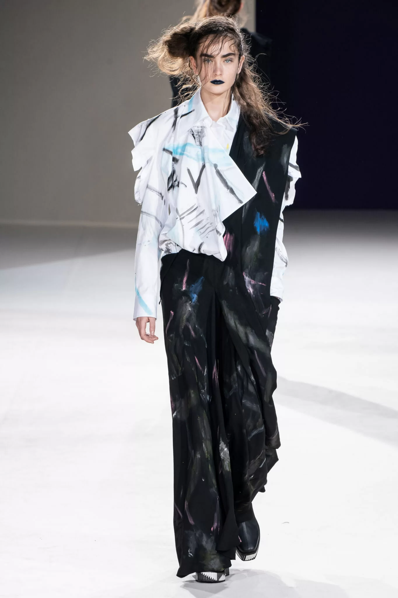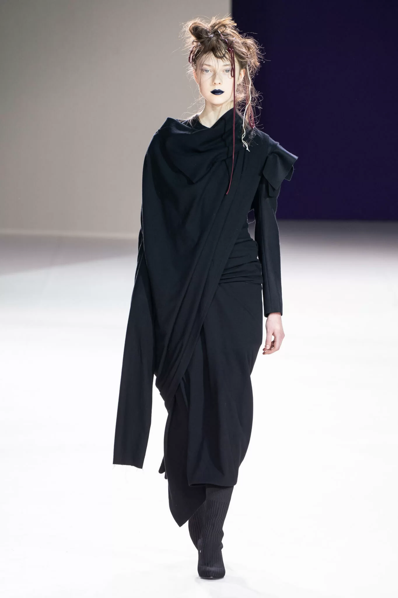 現今的時裝界變化急速、繽紛絢爛,Yohji Yamamoto十年如一日的不變反而難得又耐看。山本耀司直言這個FW19系列是他對現今時裝世界的回應:「我像個小女孩,造衣服是如此好玩,我在享受當中的過程,而不是一個時裝大師。」他回到了最初,當造衣服還是用雙手DIY的日子,所以這個系列在一貫的黑調和垂墜感中不乏拖尾的鬆散線頭、胡亂手畫的繪圖、自然隨意的刺繡等細節,藉此表現時裝原本的純粹。然而來到今日,衣服本身的設計已不再重要,嘩眾取寵引起話題才是大勢。山本耀司不否認,當中一套絨裙大褸中拼接了舉中指的手套,是對時裝界的控訴,也只有如他這般的時裝大師才有這樣的能耐,在時裝洪流中仍然堅持做自己。