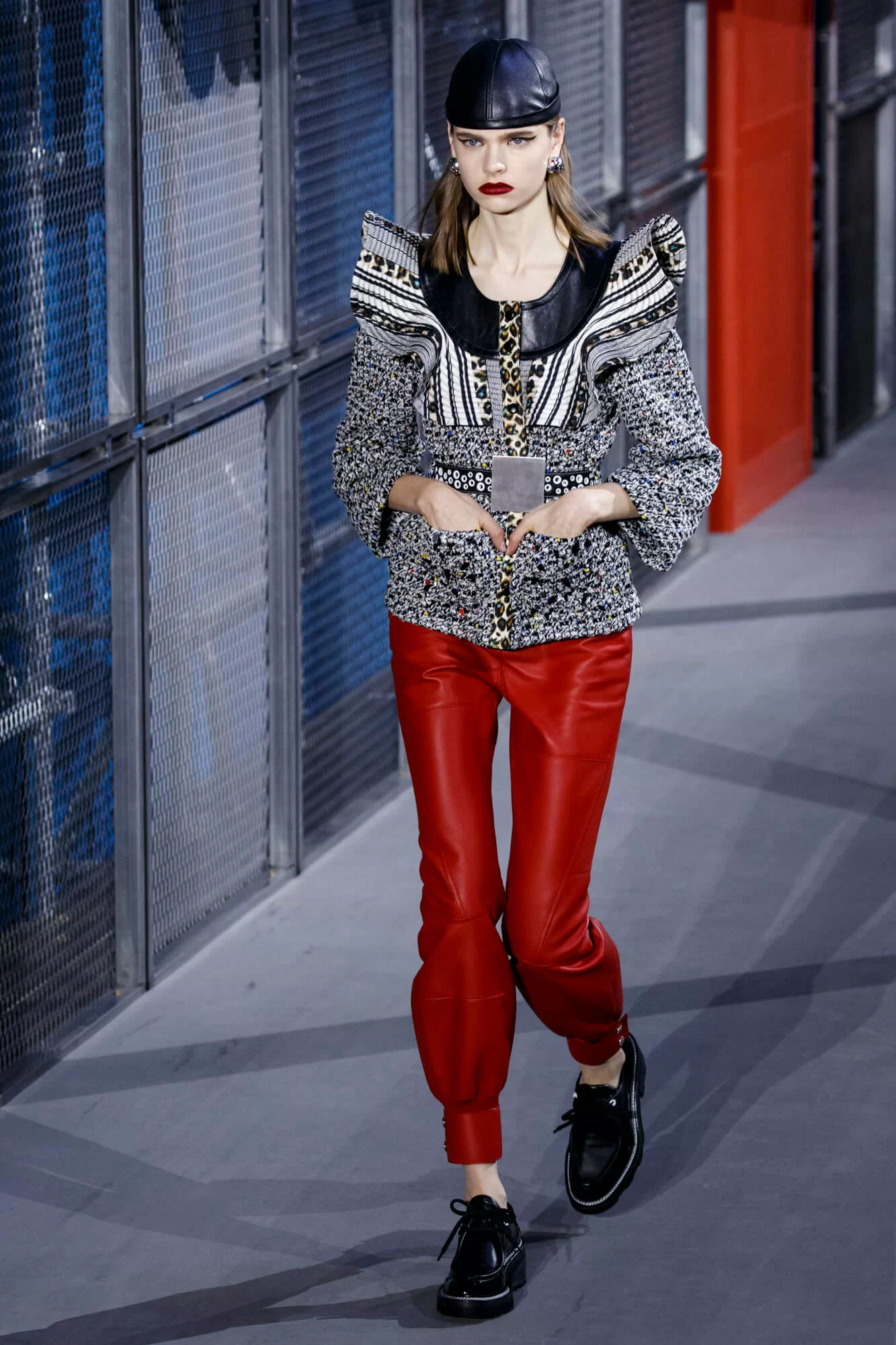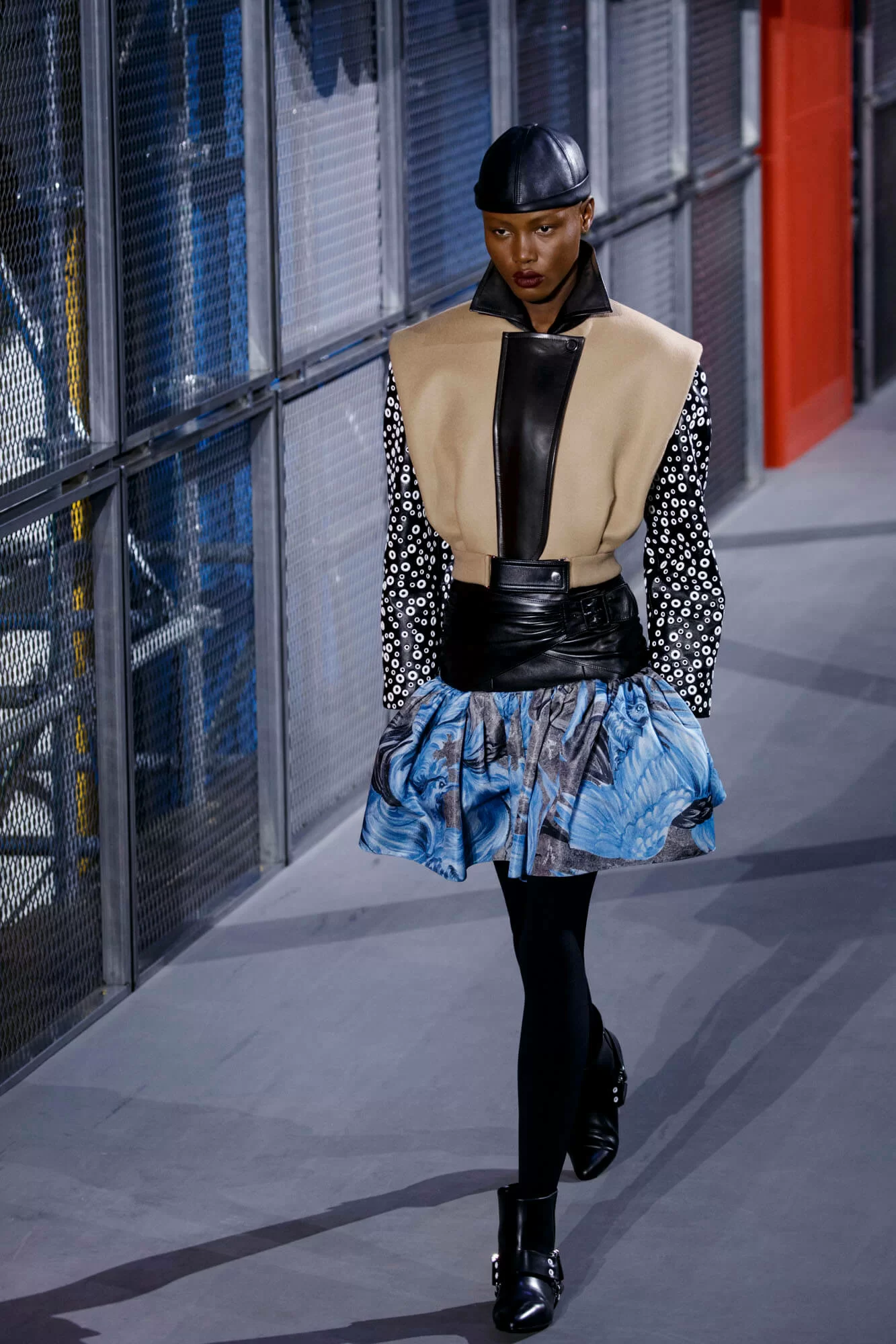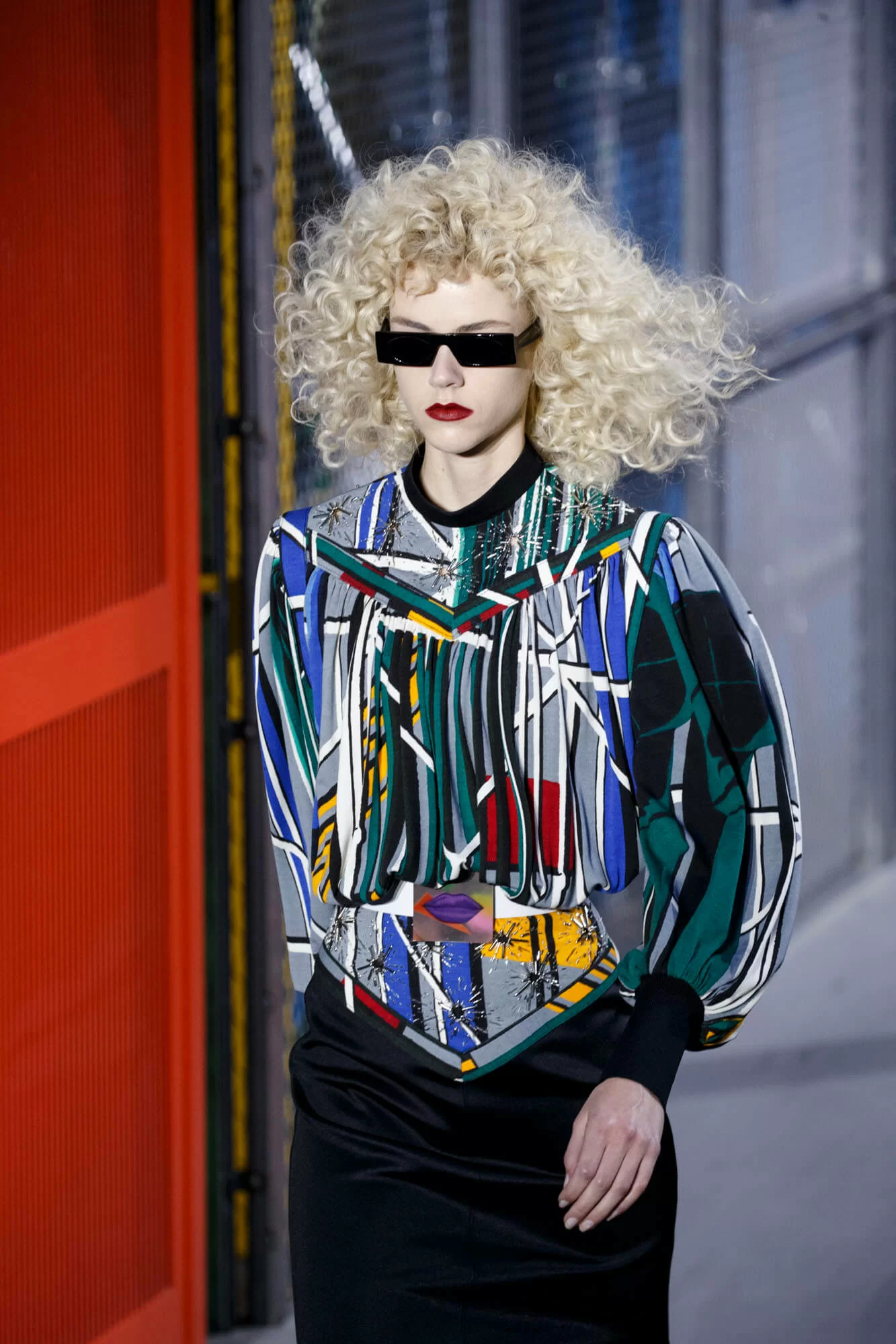 今季繼續強調肩膀線條,荷葉邊的肩部重塑了整體廓形。短裙和長褲幾乎每季都會出現,在比例上已經成為Nicolas Ghesquière的標誌性設計。系列中段開始出現一些八十年代的方形肩膀,不過稍微柔和一些。彩色的印花裙和針織,似乎在模仿龐比度中心的彩色通風管,甚至印製在皮革外套上。今季的腰部相對纖細,還有普普藝術風格的面部金屬腰帶,為造型增加一絲科技感。