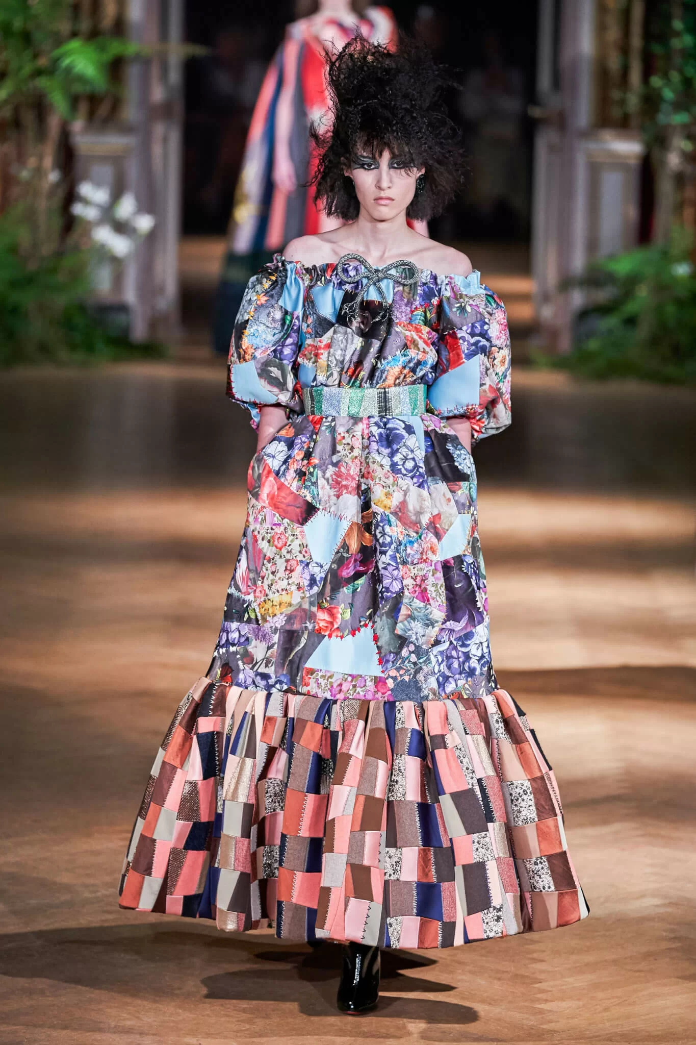 系列後半部有大量的色丁拼布,來自Viktor & Rolf工作室用剩的布料,回應了Claudy Jongstra的可持續毛氈。看似簡單的拼布,在Viktor & Rolf手中確實精緻得難以置信,因為要把如此大量和密集的拼布縫製得整齊且不突兀,甚至縫出圖案,一點都不簡單。這種手法在2018春夏季亦使用過,那些條紋和格紋拼布完美得猶如印刷上去。