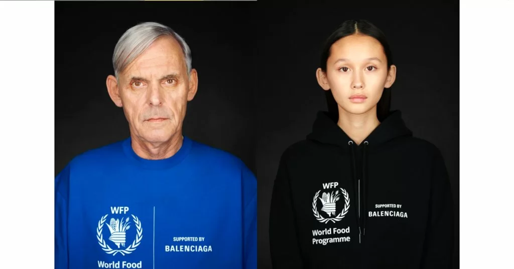 Balenciaga不只一味用奇異的角度引來大家注目,品牌早於2018秋冬系列帶有聯合國世界糧食計畫署(World Food Programme, WFP)標誌的產品,藉此提升大眾對環球飢荒現象激增的意識。最近雙方再度推出聯乘系列,希望大眾追求時尚的同時,能夠為飢荒地區出一分力。