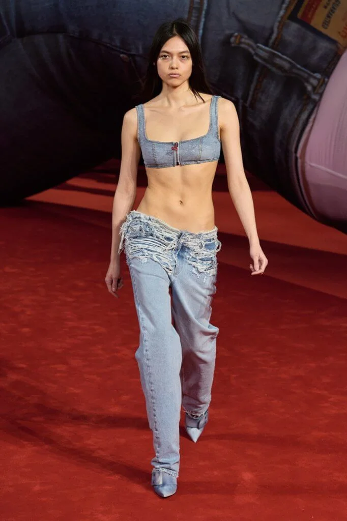 今季繼續從牛仔布岀發,採用經循環再用的牛仔布、棉花及彈力棉同時運用無水靛藍染色技術製作服飾。系列大玩實驗主義顛覆設計:仿如短裙的超大碼牛仔腰帶看似僅一繩牽引,實則內附隱藏腰帶,大玩腰部設計、做舊牛仔效果的長褲及錯視圖案的牛仔互相碰撞,更加入了獨特塗層處理,令衣服保持堅挺同時散發光澤、將牛仔營造出一種「剝落」的質感,經人手剪碎制成人造毛皮效果,就如從牆面揭下層層海報一樣。最後更出現全身噴上金屬光粉紅、粉藍與金色的模特兒,穿著與膚色一樣的金屬塗層服裝,充滿未來感,帶來一場叛逆而充滿玩味的牛仔布實驗時裝秀。