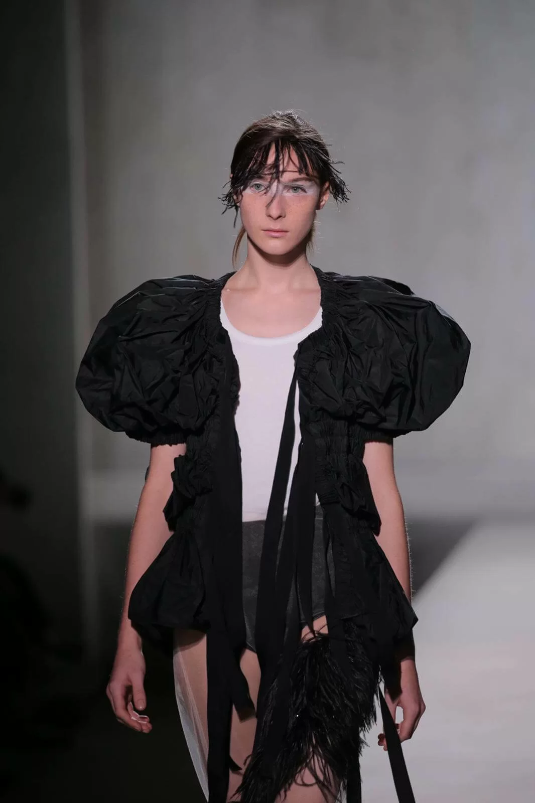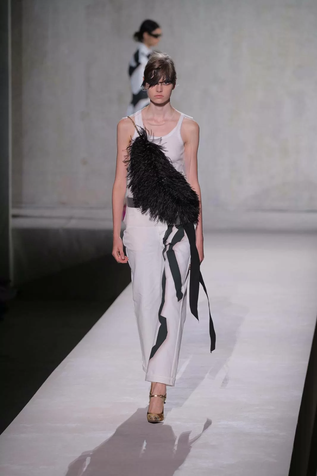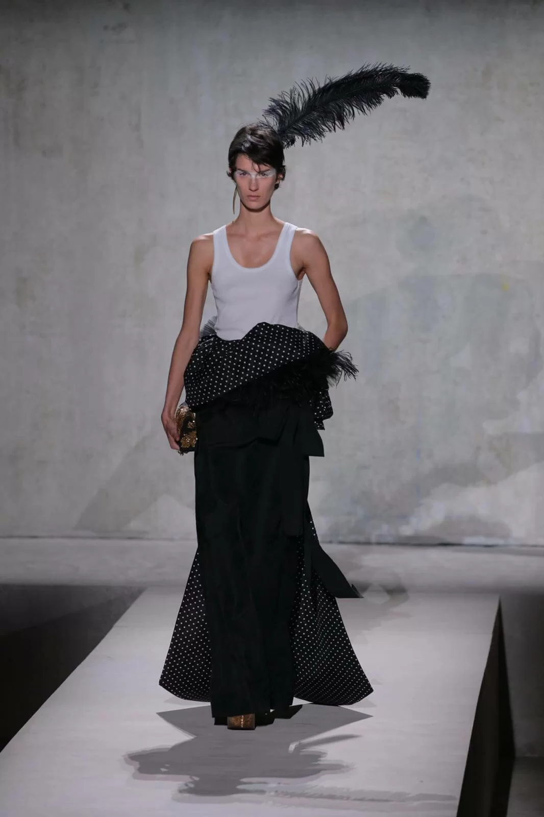 時裝秀以一套全白的羽毛蕾絲長裙閉場,薄紗從腰間延伸出一層層的皺褶和流蘇,彷彿天使下凡,與Van Noten和Lacroix同場,為Dries Van Noten時裝秀完滿落幕。