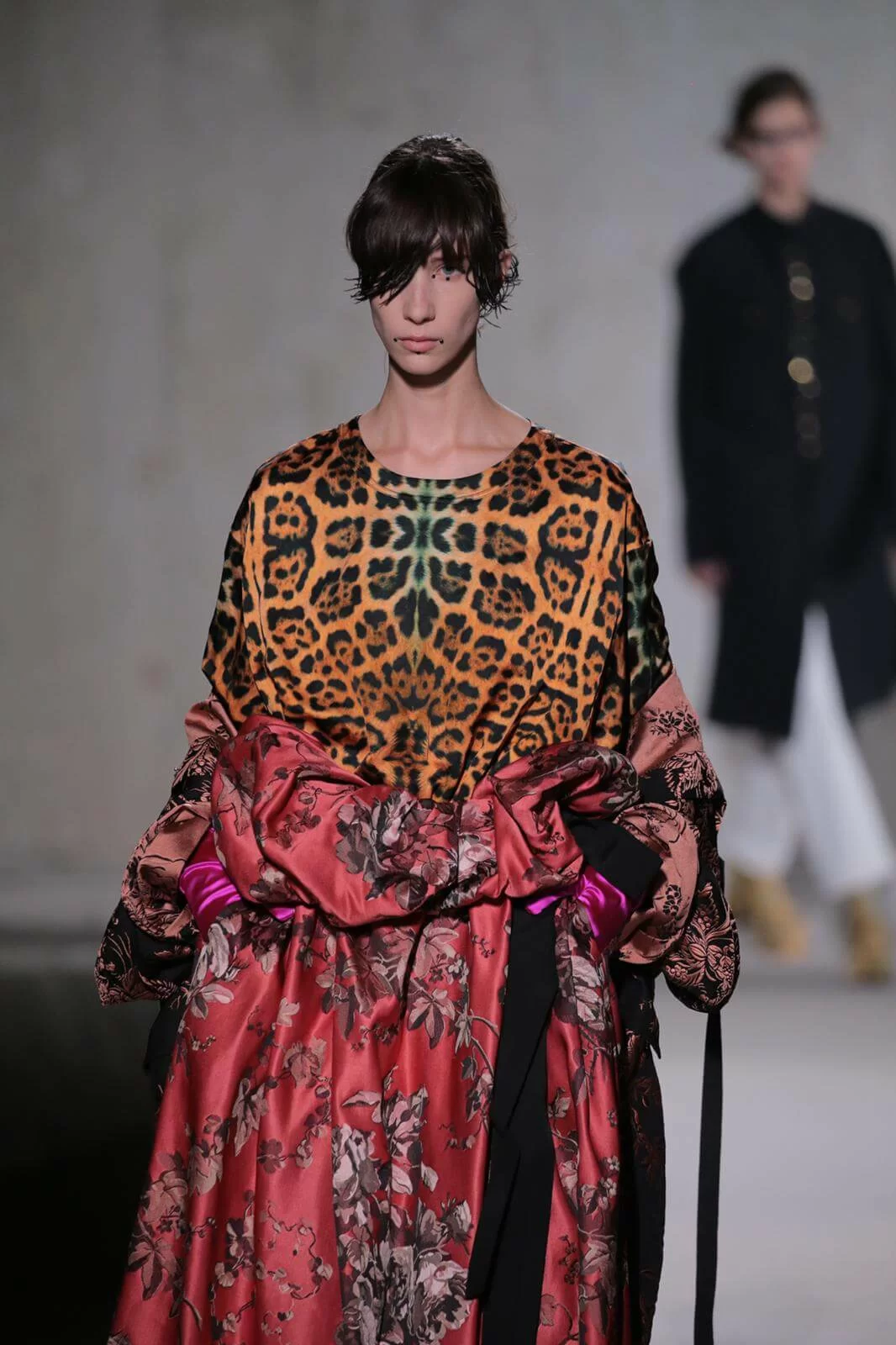 時裝界變幻莫測,但Dries Van Noten今時今日仍然忠於他對花卉、色彩的熱愛,他和Lacroix送上了繁複繽紛的動物紋元素、花卉圖案,配上宮廷式的面料,例如紡紗和緞面材質等,整個表演根本是一場視覺盛宴。