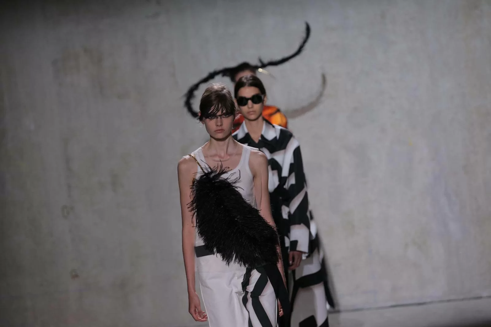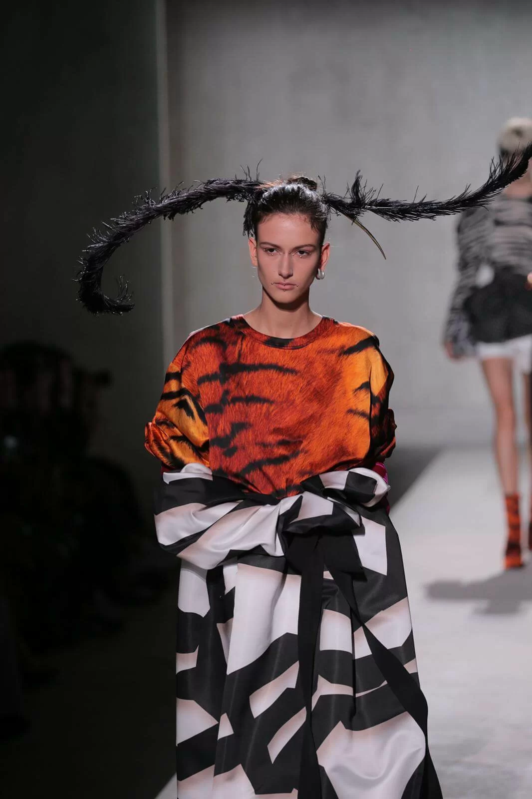 Van Noten認為,如今世界無論在經濟、政治還是環境上,都越趨分裂和單調乏味,或者他的極繁主義(Masimalism)可以為創作帶來更多活力和靈感。所以這一季出現了橙紅色漸變的虎斑和釣紋,還有色彩斑斕的標誌性印花,以誇張的羽毛裝飾和拖地長裙吸引大家的眼球,毫無保留地宣示系列的熱情。