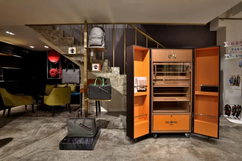 旗艦店著重藝術與生活的融合。Fred Pinel本身是一個藝術愛好者,他認為藝術與生活是缺一不可的,從櫥窗至室內設計亦會加入藝術的元素。皮革貯物櫃不論外型和手工精緻得有如藝術品,店中的裝潢設計更是一絲不苟,Fred Pinel刻意重現巴黎旗艦店,將法國凡爾賽宮的原木色地板呈現出來,並混合中國元素,把一幅又一幅30年代的舊報紙展示在一面牆上,希望將中西文化和傳統工藝與藝術完美地結合。他還精心挑選高級物料、傢俱和當代藝術品作裝飾,店內還設有休息專區和酒吧,彷彿在家中購買般,有種賓至如歸的感覺,逛完可稍作休息。店子由10月起會定期進行藝術展覽計劃,展出不同當代藝術家作品,例如法國當代藝術家 Kongo、Hom n’Guyen 和 Jean-Pierre de Freitas ,相信光是藝術品已讓人目不瑕及。