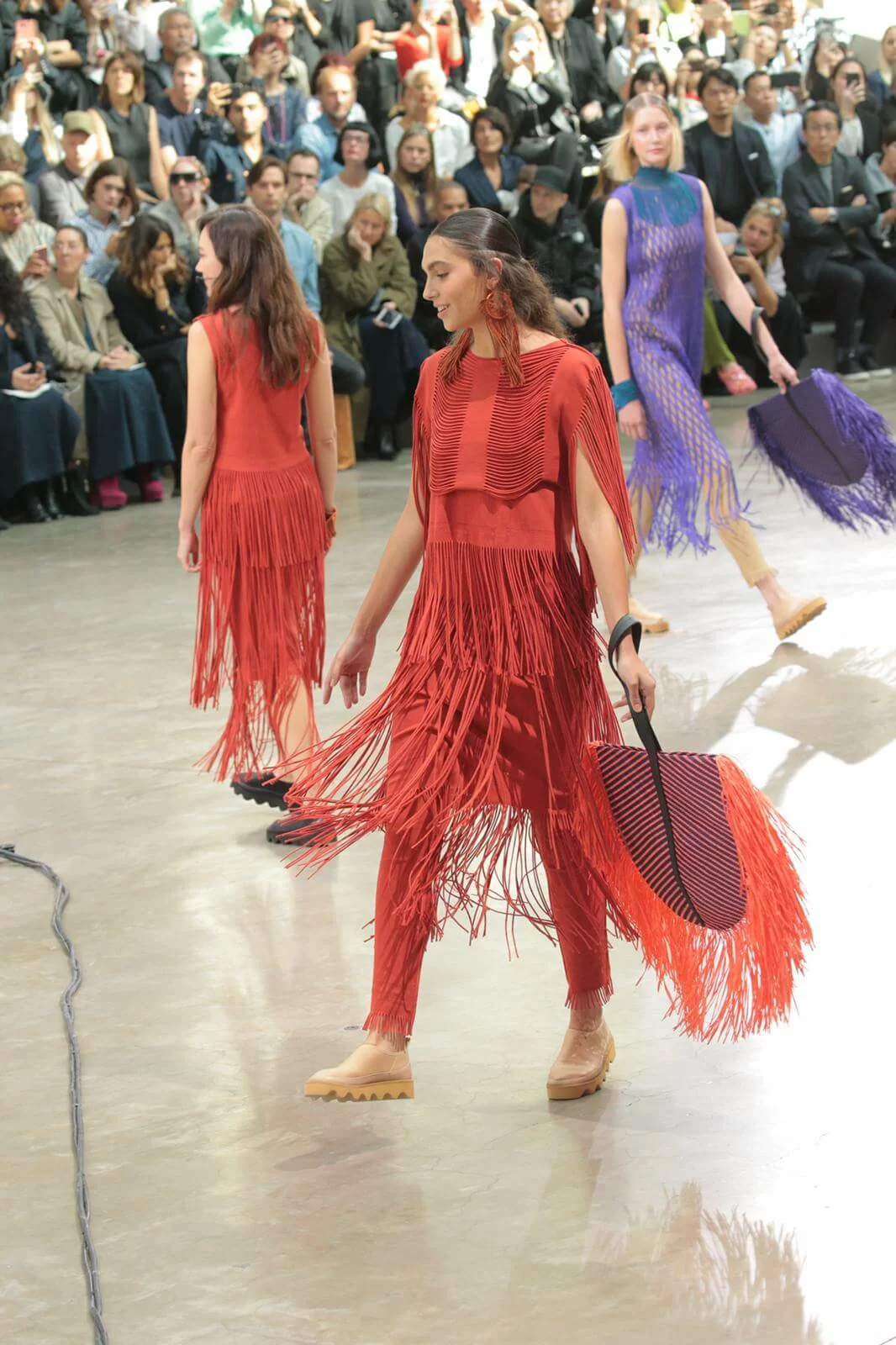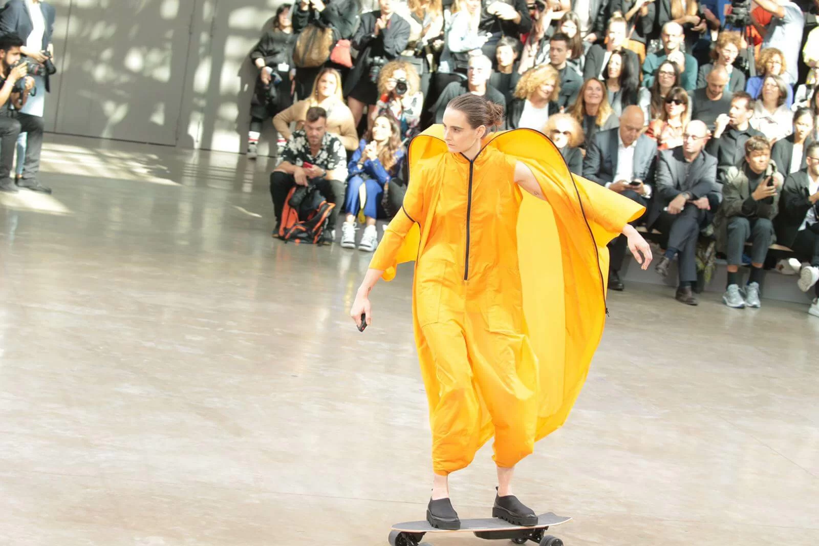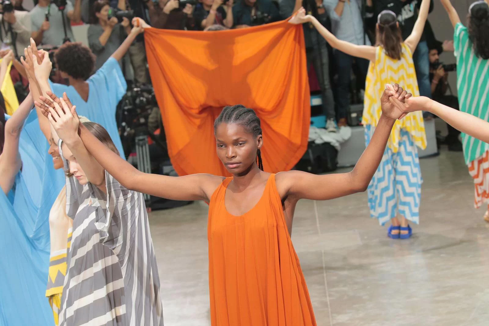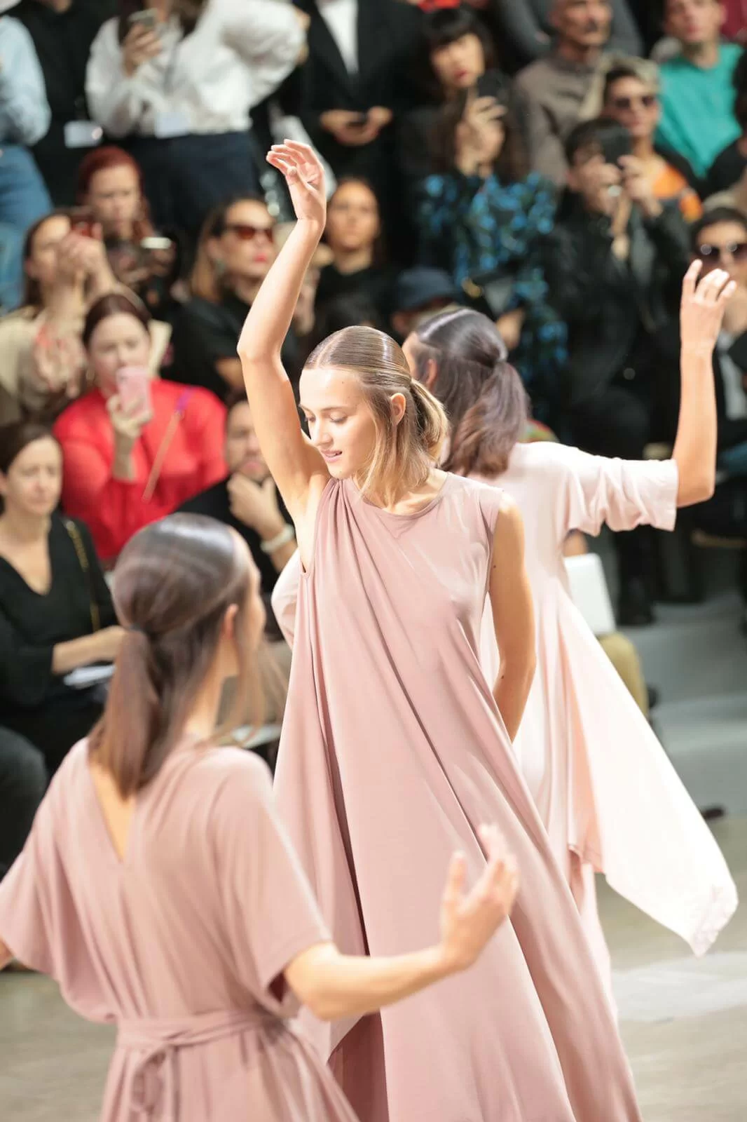 回到這份最原始的本能,品牌希望把對布料製作、染色技巧的研究,分享給所有人,所以模特兒以舞蹈的形式登場,身穿正裝或Sporty 風的衣服,不停旋轉與跳躍,拉開繽紛歡樂的氛圍。最讓人難忘的應當數從天而降的裙子,套在原本只穿內衣的模特兒身上,能展示衣服不會皺、具彈性的特點外,也帶出了衣服為穿著者送上的生命力,原來就是這樣簡單直接。