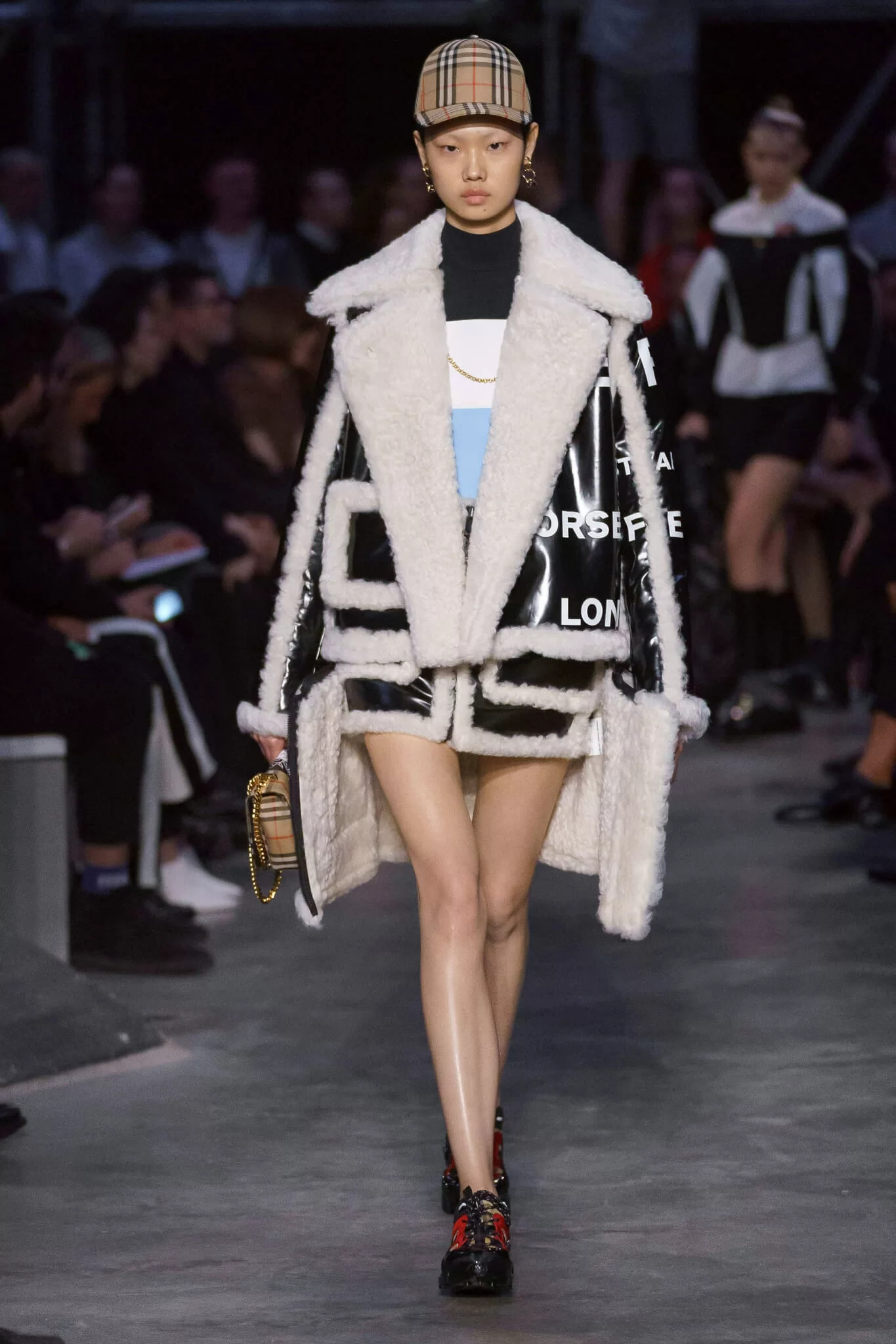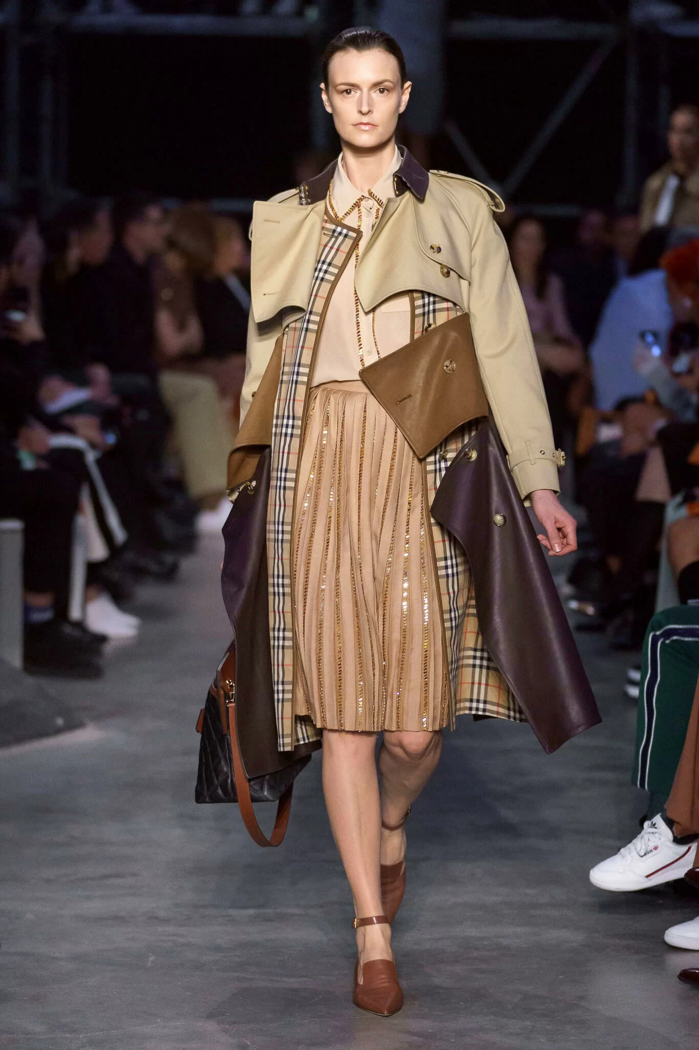 Riccardo Tisci將這場騷命名為“Tempest”(暴風雨),一場英國文化與氣候的對比,帶來超過100個造型。開場十幾套無疑是面向年輕一代的口味,以及他本人一如既往對於街頭風格的熱衷,而經典的Burberry格紋在微調了色調和拼貼後,不再是上一代獨有的產物。來到中段,機能性羽絨和禦寒大衣頻繁出現,男士都揹上了女性化的鐵鏈小袋,以及各種出其不意的混搭。時裝騷的後段是一場社會菁英的強大陣容,大量採用奢華面料的西裝和駝色套裝,去年全新創造的monogram也點綴在不同的單品上。