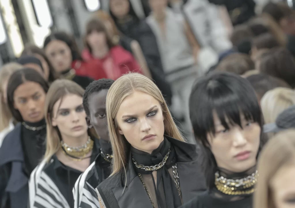 系列多種面料互相拼接,用複雜的結構塑造出多層次的設計,看似穿上多件衣物,實質是同一件衣服;不論是雪紡邊的絲綢外套,繫上繩帶的半身裙,還是鬆散不對稱的圍巾,都散發著Sacai率性和帶點叛逆的風格,而金屬扣涼鞋的配搭,更讓造型多了分不羈和隨性。
