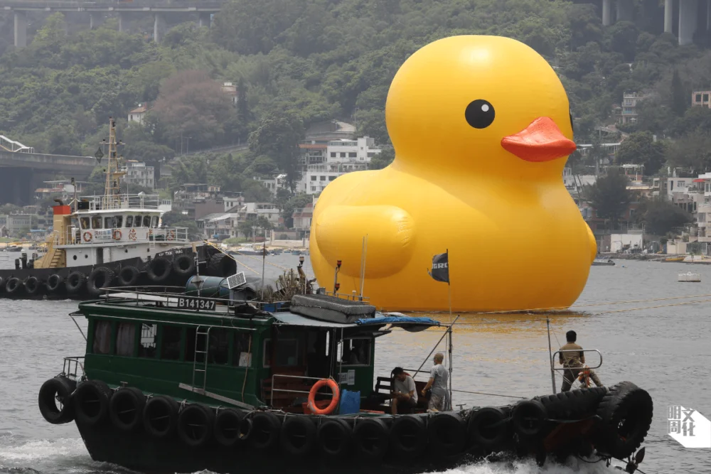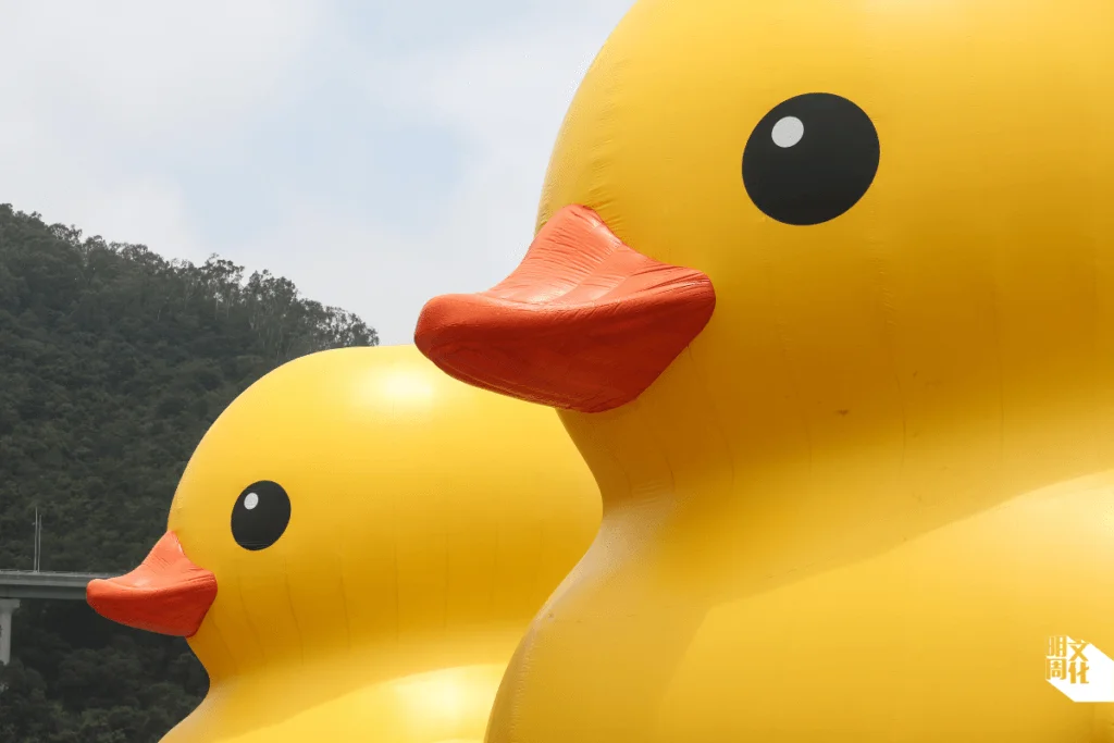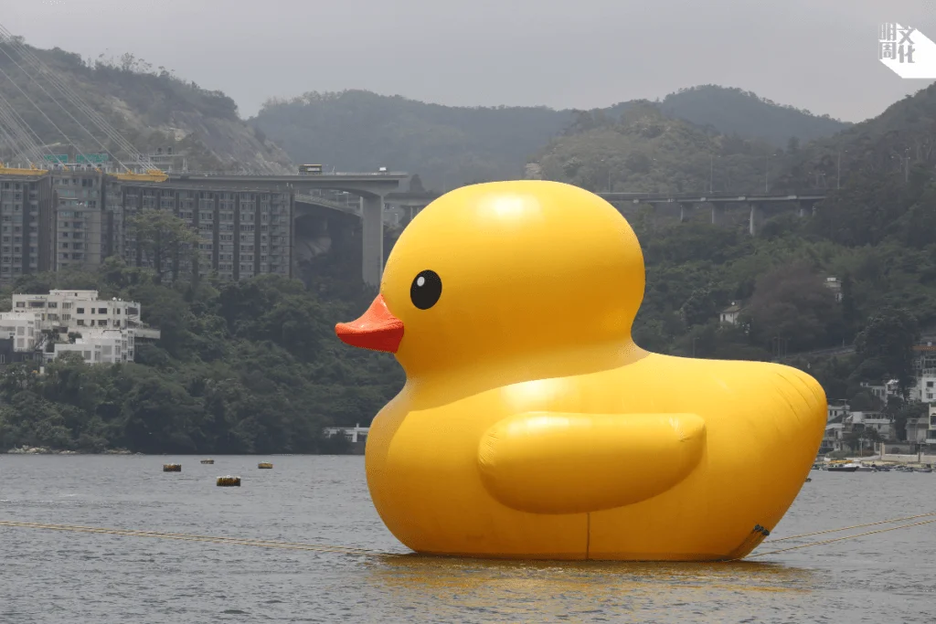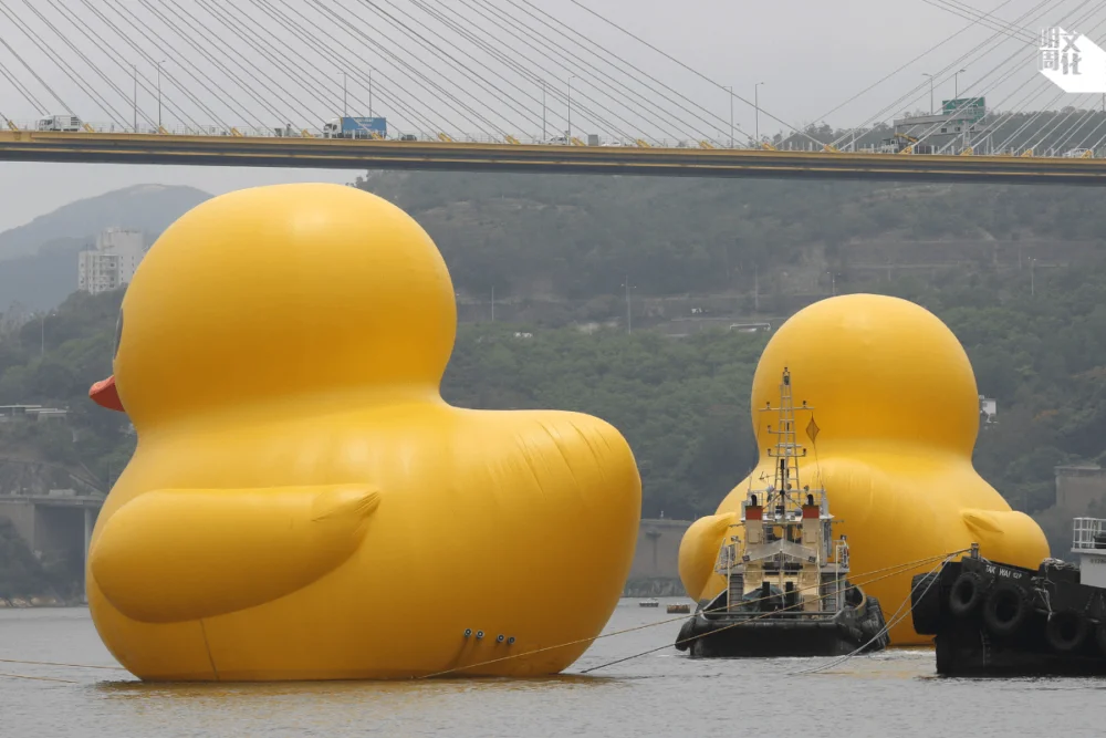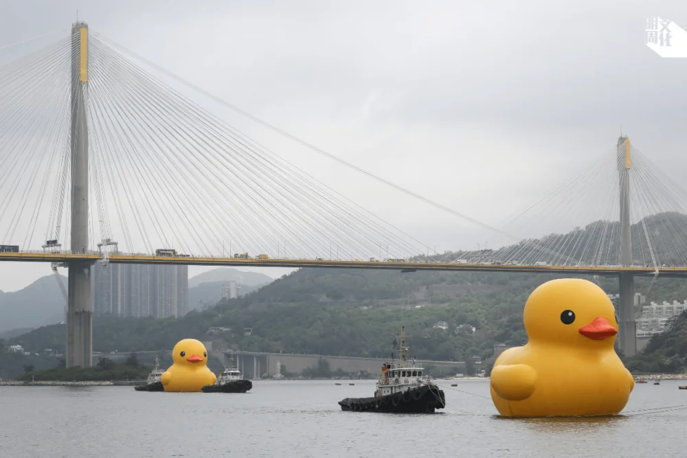 最為人熟知的作品,不能不提「Rubber Duck Project」──軟綿綿的巨黃膠鴨跳出浴缸,把世界不同港灣當作戲水泳池。巨黃鴨曾於2013年春夏之際在港展出,掀起一波追鴨熱潮。10年過去,25日清晨時分,青衣船廠附近竟出現巨黃鴨「打孖」試水的蹤影,雙倍驚喜非常搶眼,引來市民圍觀拍攝。