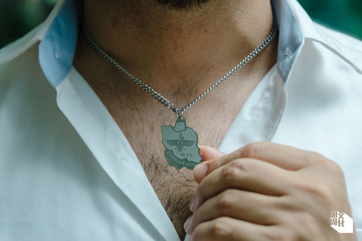 Nasiri每天都會戴着伊朗版圖吊墜的項鏈,中間的圖案是古代波斯帝國國教瑣羅亞斯德教(祆教/拜火教,Zoroastrianism)的標誌。
