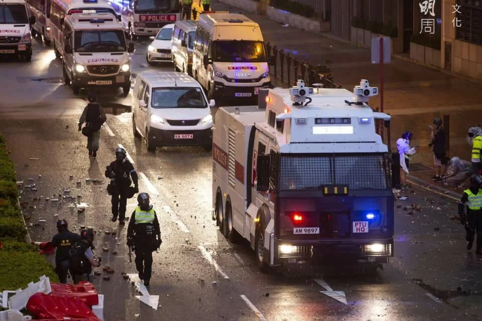 大約六時,警方出動水炮車、裝甲車到達楊屋道,期間兩度向示威者架設的膠馬路障,發射水炮。