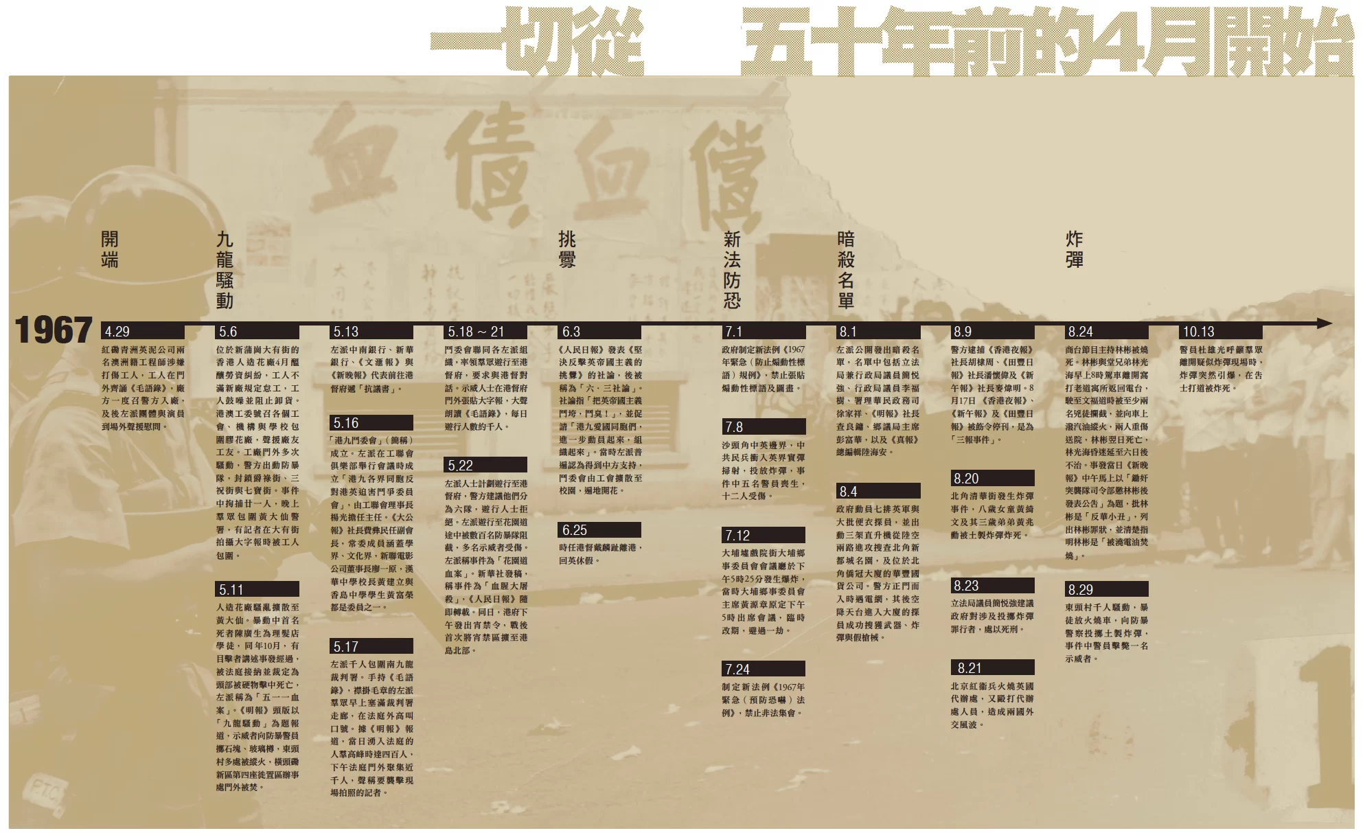 五十年後,今天重看六七暴動,不應只有血肉模糊的零碎片段。《明周》簡列時序,鋪叙事件,冀能借古鑑今。