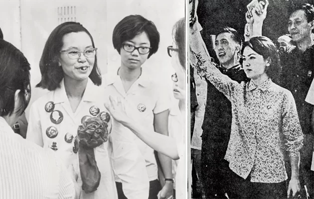 (左)據《明報》,5月有左派記者身上掛着大量毛澤東襟章 到港督府示威。 (右)左派演員石慧參與示威。 1968年石慧與其丈夫傅奇被警 方遞解出境,惟中方拒讓他們 入境,二人遂滯留羅湖邊境, 石慧和傅奇最終留港生活。