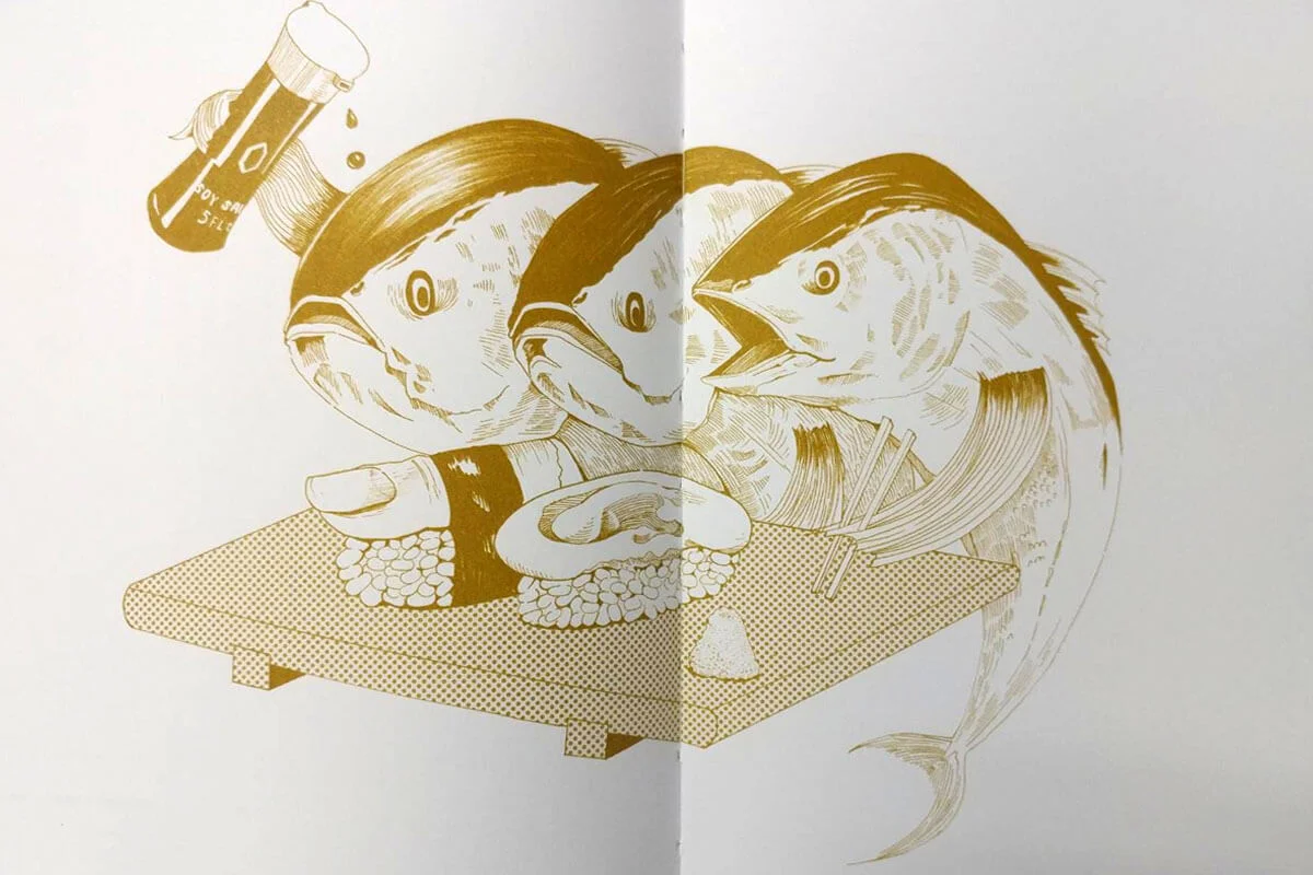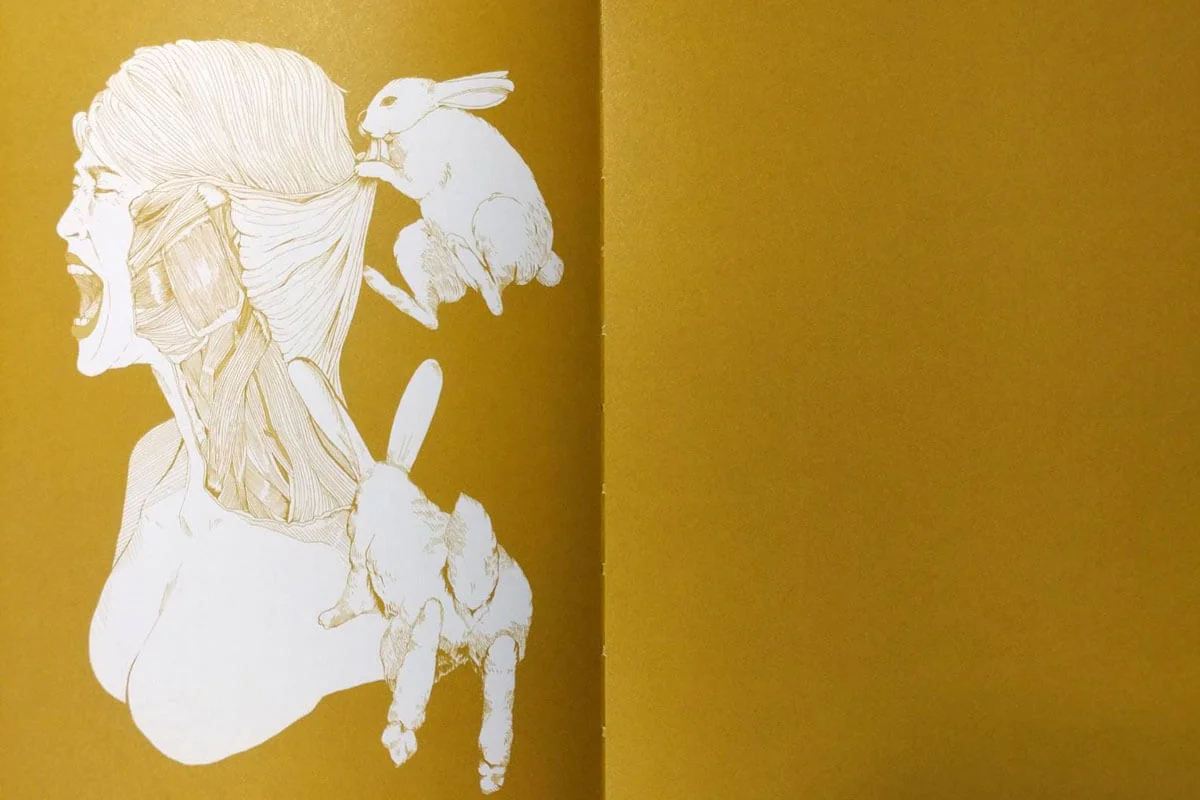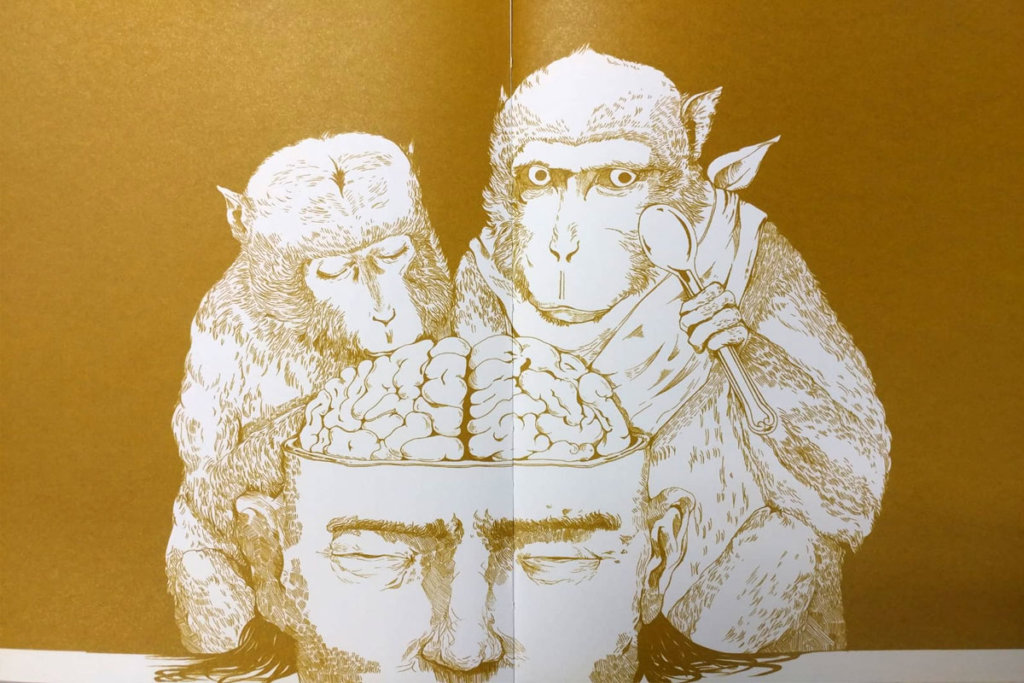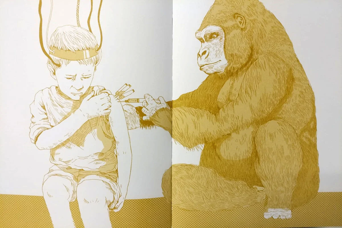 湯文舜透過一系列的插畫和文字,將人與動物角色互換。人類浸泡在油污中過活、黑猩猩在人類身上插滿針筒、猴子挖開人腦進食、人皮被兔子徒手撕扯……