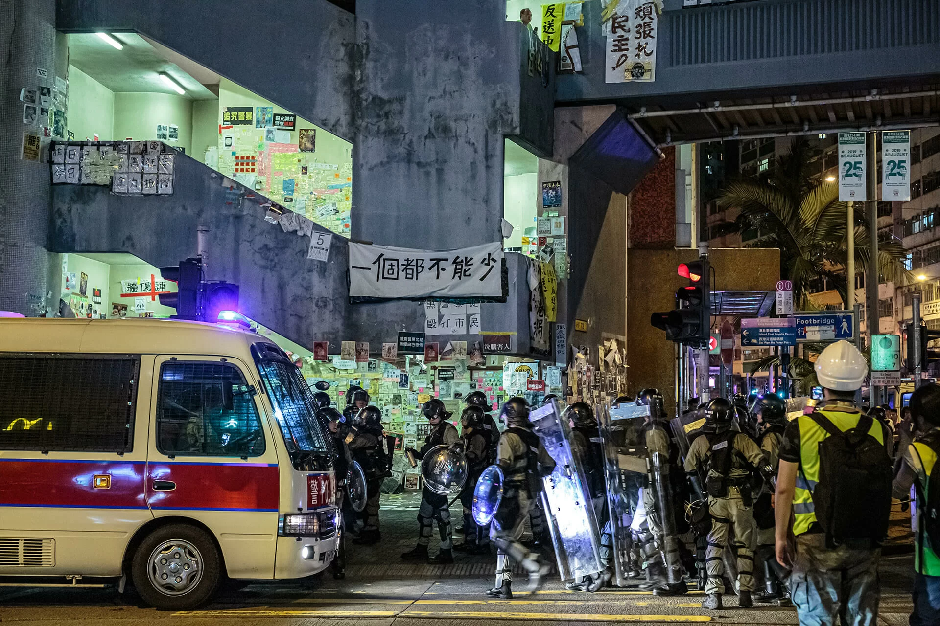 8月11日,晚上近十一時,過百名防暴警察由太古,沿筲箕灣道大街及成安街,向西灣河推進,突襲文娛中心對出天橋的連儂牆。警方先搜查在場市民,在毫無解釋下,拘捕數名沒有裝備的年輕人,引起街坊不滿。過百名「踢住拖」的街坊集結在大街,與警員口角,期間防警曾近距離施放胡椒噴霧,多名市民「中椒」,要在地鐵站內急救。