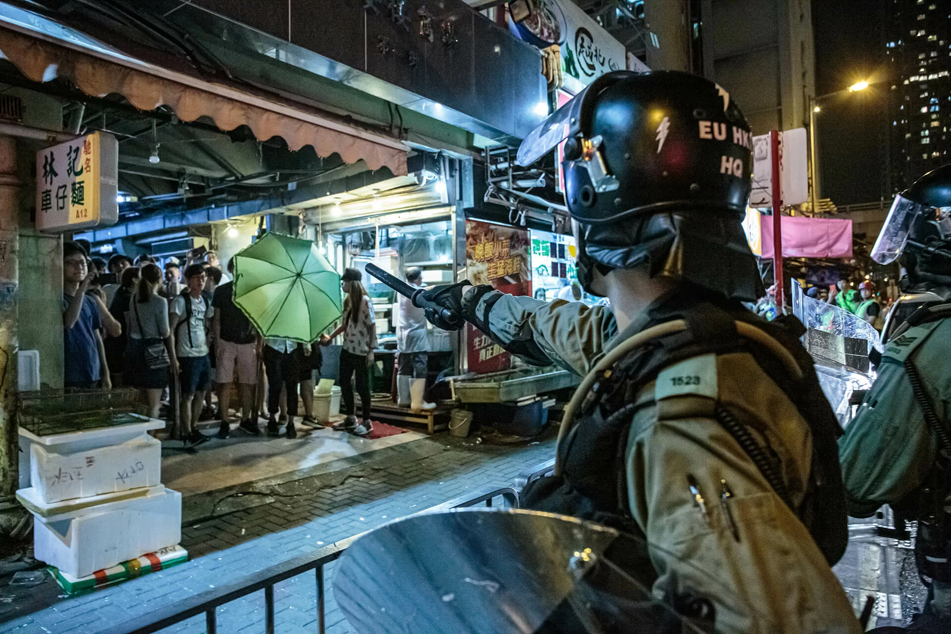 十五分鐘後,郭志聰獲放行,卻有手無寸鐵的年輕人不幸被捕。此時行人路已聚集過百名聲緩的街坊,並與駐守在筲箕灣道的防暴對峙。約十一時半,速龍小隊到場,護送警車及防暴收隊離開,觸發警民衝突。「街坊好嬲,要求警察解釋,但那一班有長盾警棍的防暴,只是用強光照射街坊。」郭志聰形容,現場市民沒有衝擊行為,最多只跟警員口角,但部分情緒激動的警員,卻在大馬路上,向行人路的街坊,近距離施放胡椒噴霧,令多人受傷。