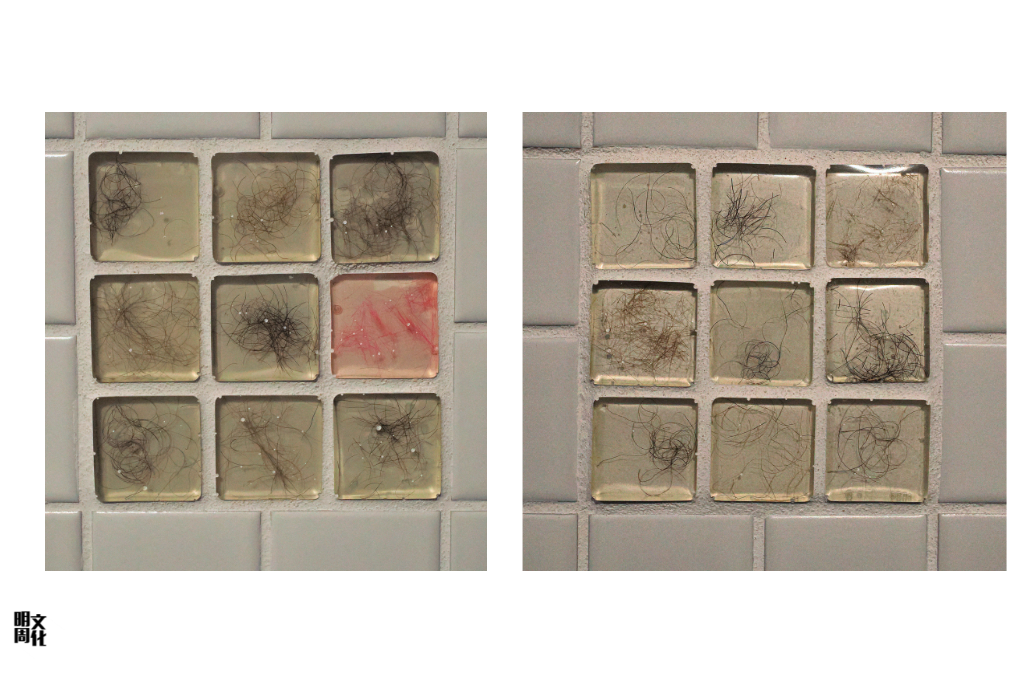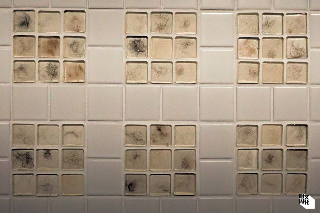 那是一幅由幾十塊透明樹脂磚拼貼而成的壁畫,每一塊磚裏都封存着真實的陰毛——有些是直的,有些是鬈的,顏色從淺金到深黑不等。磚塊排列成浴室瓷磚的模樣,牆角甚至模擬了浴缸的水龍頭和瓷磚縫隙裏的「污漬」。這面牆的名字叫「Ornament Grime」(裝飾污垢)。瓷磚與毛髮分別象徵整潔與骯髒,兩者互相融合、衝撞,挑戰着社會對美感與藝術的慣常認知。