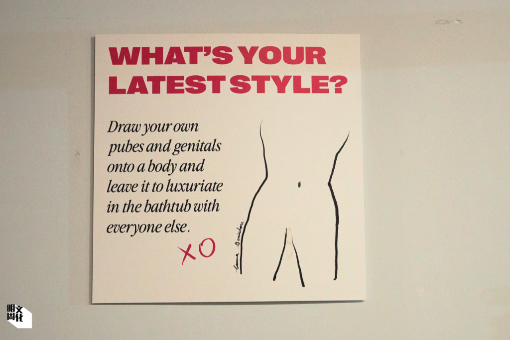 壁畫旁邊還有一個浴缸,裏面堆滿了訪客的作品,他們印有公仔模型的紙張上,被畫上了各自陰毛的位置。旁邊印有輕鬆的告示:陰毛,並不是一件令人羞恥的事。