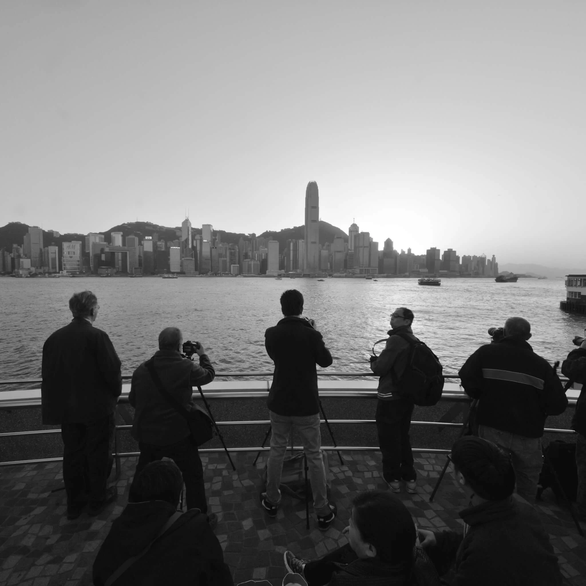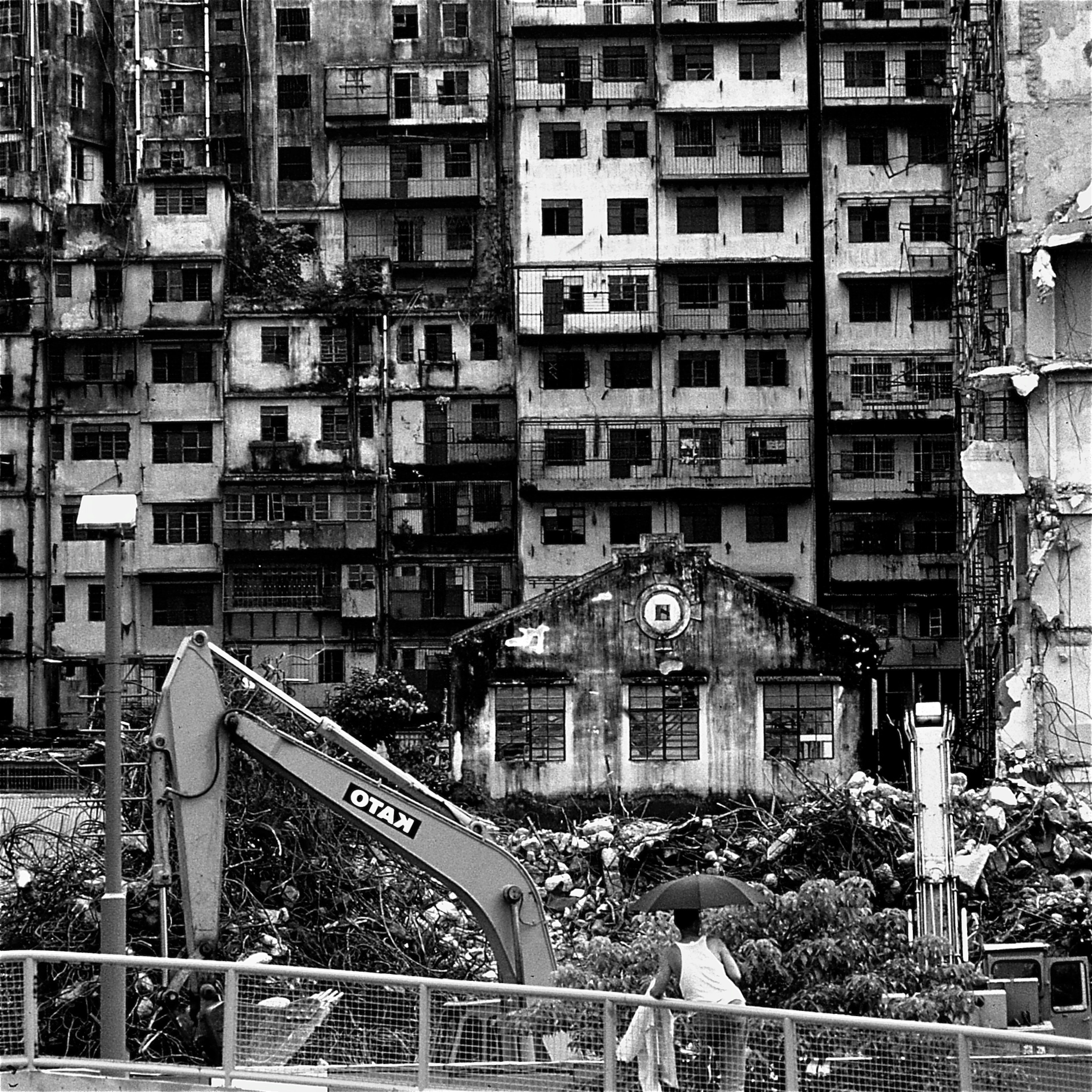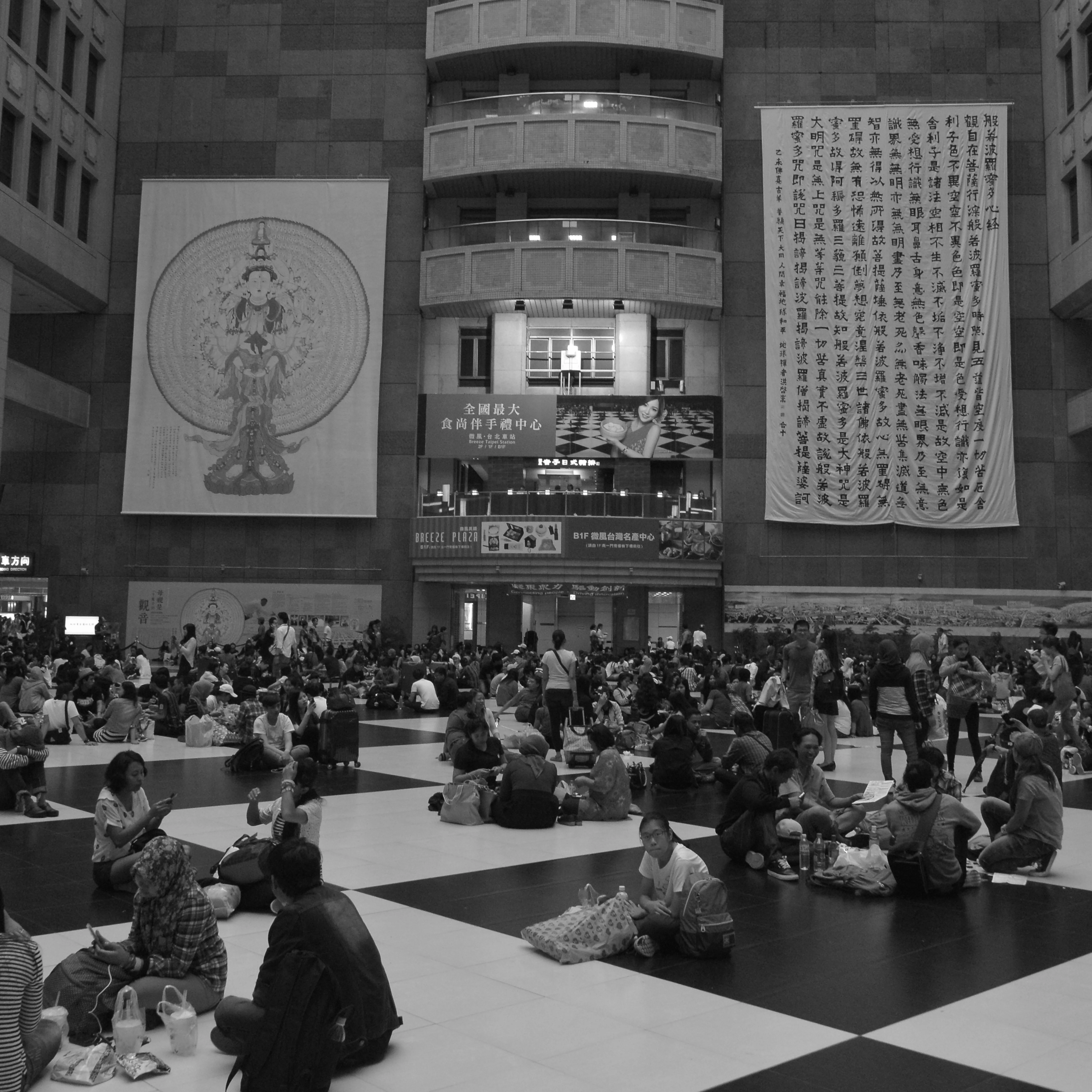 張教授的構圖充滿細節,甚至是一些未被留意或遺忘的「世間相」。二○一六年,他拍攝台北車站,牆身掛上菩薩像和經文,在車站攤坐地上正等待旅程的人,有穆斯林,有一家大小,有年輕的戀人,也有背包客,各人的輕鬆動態都被定格凝住了。他故意讓一幅攝於一九八五年的九龍城寨與之並置,出人意表地打破了固有的時空。九龍城寨曾經是一個人口非常稠密的三不管地方,相中有一個男人站在地盤外,正在目睹這座圍城滅亡的狀態,彷彿意味香港人的命運與無助。