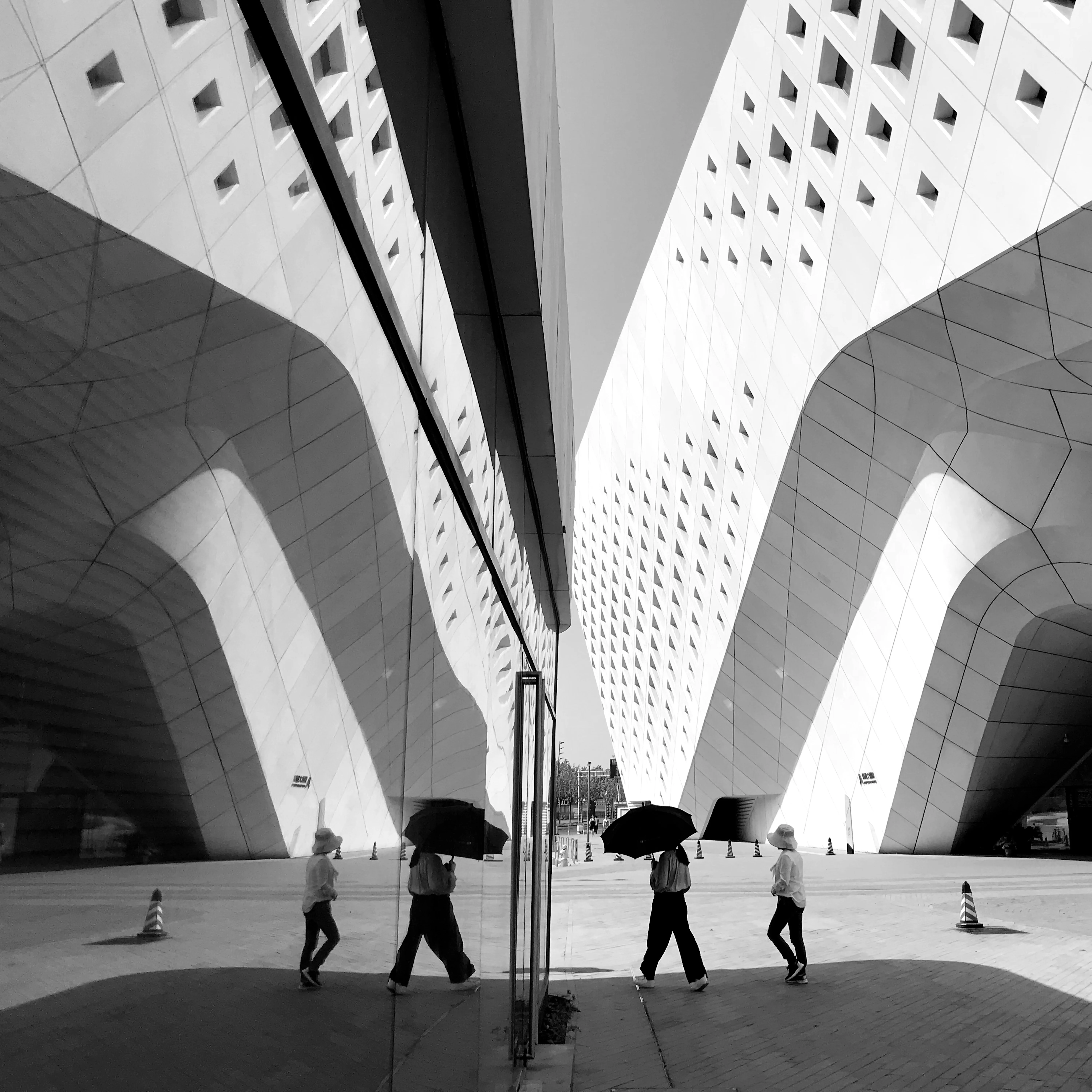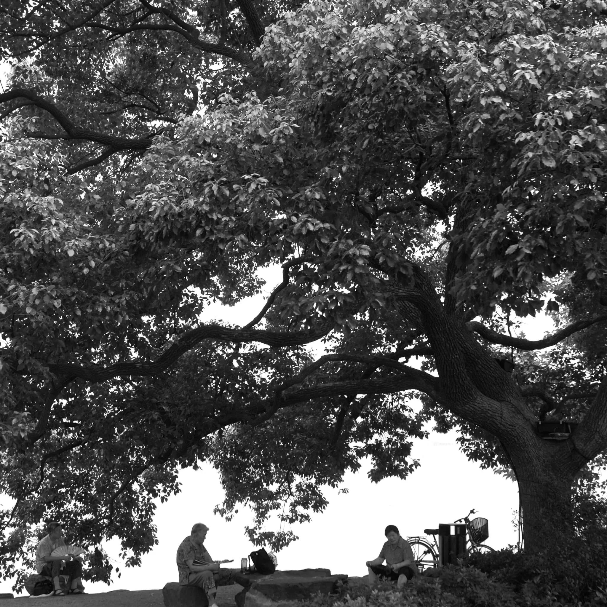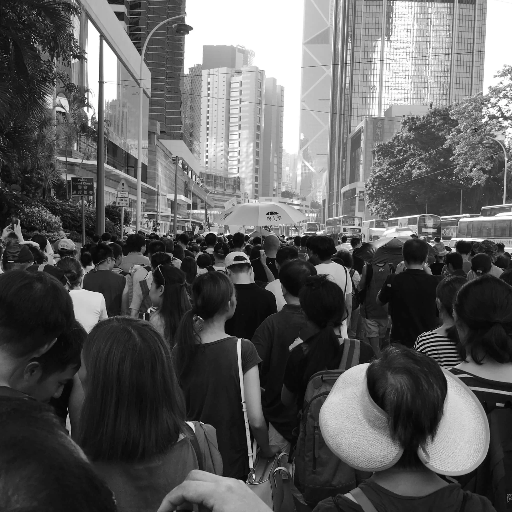 張教授的構圖充滿細節,甚至是一些未被留意或遺忘的「世間相」。二○一六年,他拍攝台北車站,牆身掛上菩薩像和經文,在車站攤坐地上正等待旅程的人,有穆斯林,有一家大小,有年輕的戀人,也有背包客,各人的輕鬆動態都被定格凝住了。他故意讓一幅攝於一九八五年的九龍城寨與之並置,出人意表地打破了固有的時空。九龍城寨曾經是一個人口非常稠密的三不管地方,相中有一個男人站在地盤外,正在目睹這座圍城滅亡的狀態,彷彿意味香港人的命運與無助。