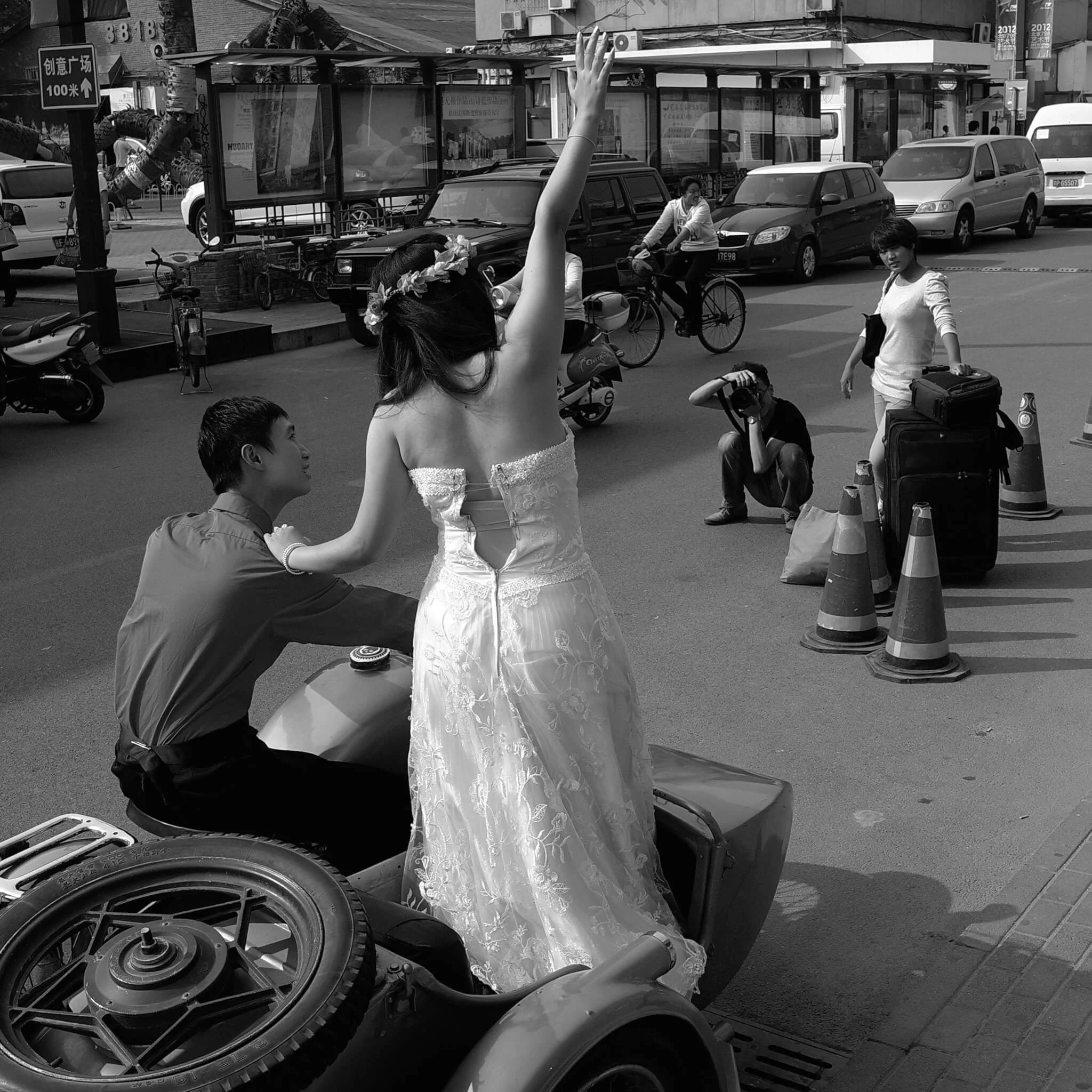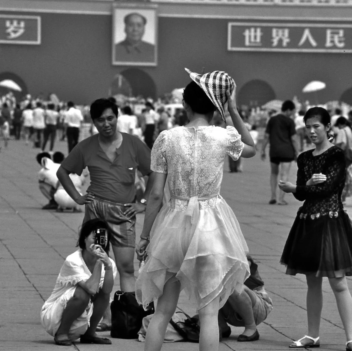書中,第一張作品是他在一九九一年拍攝天安門廣場的一個情景:一位準新娘在拍攝婚紗,親友蹲下來旁觀,六四事件兩年後,廣場一片歌舞昇平,血腥鎮壓不再留下痕跡。無獨有偶,他在二○一○年在北京街頭,遇上另一對新婚夫婦在拍攝婚紗照,新娘身穿的白色裙子,因無法扣上原本鈕釦,需要額外加上安全別針,她站在一輛電單車上,像是為了勝利而高舉手臂。