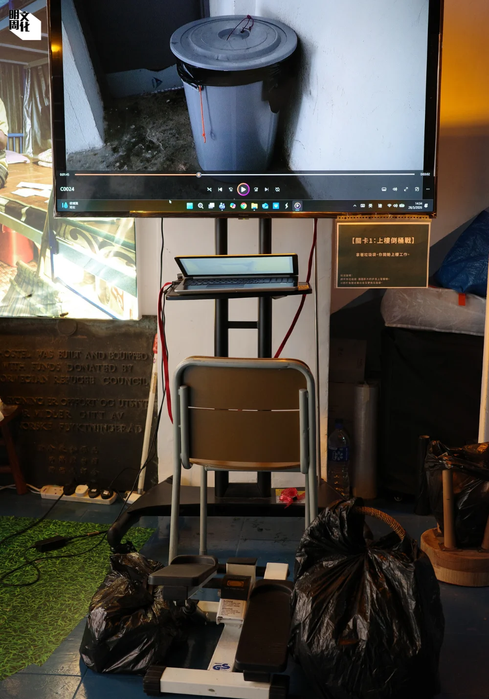 活動設有四個關卡,第一個關卡要求參加者提着沉重的垃圾袋,模擬穿梭於唐樓狹窄而高聳的樓梯。活動負責人、香港基督教工業委員會項目幹事Maggie表示,唐樓單位經常被分割成多個劏房,一個單位已可產生數戶的垃圾量。要清理一棟八層高的唐樓,工人往往需要來回多趟,每日工作下來,隨時要走數十層樓梯。而清潔工人多數年邁,長年勞累下,身體常出現勞損或工傷。