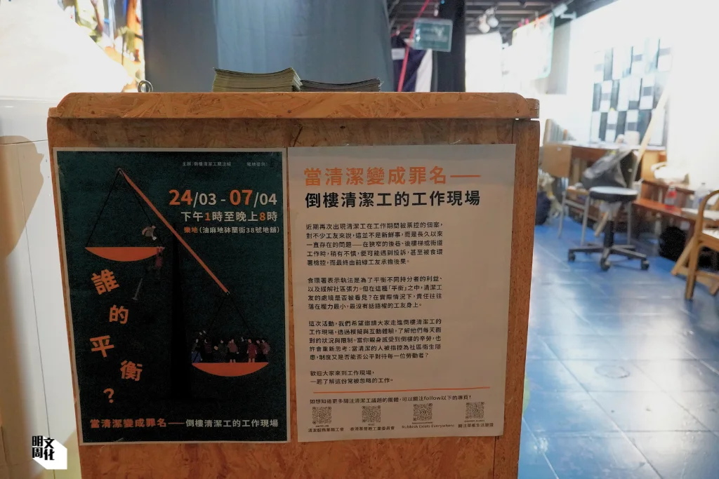 近期接連出現清潔工在工作期間被票控的個案,令關注清潔工權益團體感到荒謬:「為何處理垃圾的勞動者,會被票控亂拋垃圾?」為此,他們舉辦了名為「當清潔變成罪名——倒樓清潔工的工作現場」的體驗活動,邀請公眾走進倒樓清潔工的工作現場,透過模擬與互動體驗,了解勞動者每天面對的狀況與限制。