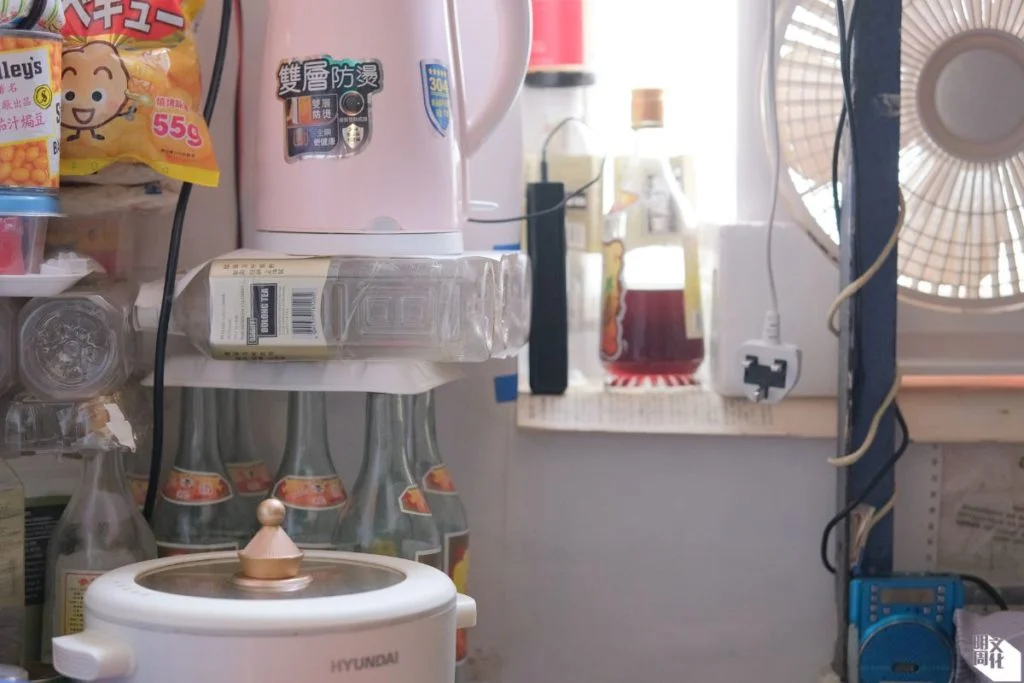 若說告別無家者身份入屋後,生活上有何分別,啤酒雄說是煮飯。在七十呎的板間房內,他的「廚房」是兩呎半碌架牀旁的摺枱,萬用煮食電鍋是他唯一的廚具。置物架則是由三個一千五百毫升烏龍茶膠樽自製成的小層架。「公園沒法煮食,一年四季也是食飯盒。飯盒凍了,也是冷食。」他說。