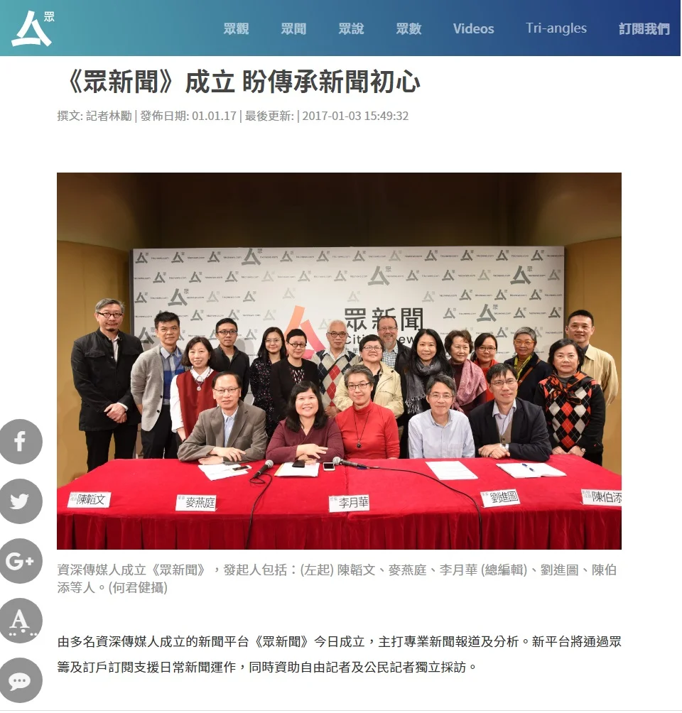 在一七年初面世的《眾新聞》,由十名本名傳媒工作者、學者創辦,主要倚賴眾籌形式營運;在《立場》停運後數天,也難抵壓力無奈解散。
