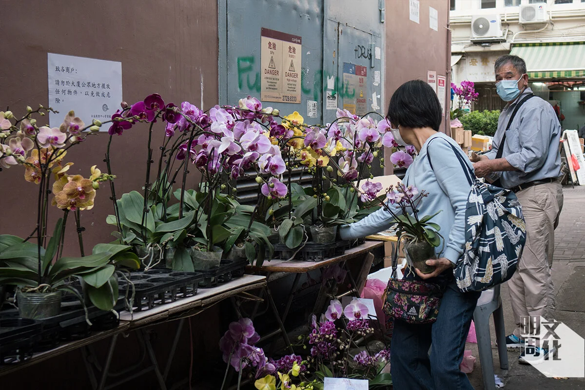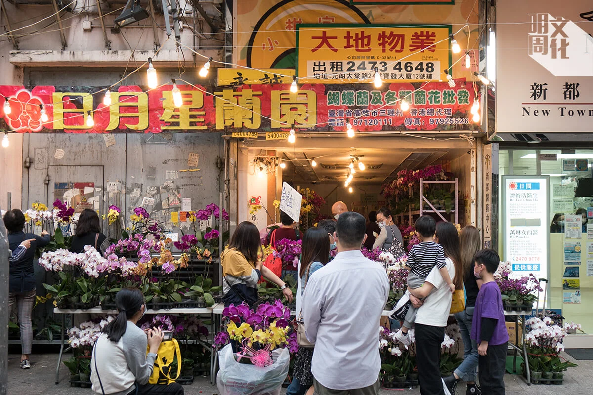 在元朗和上水,不少藥房、餐廳、雜貨店,都變身成臨時年花散貨場,有的在舖前的當眼範圍,售賣年桔和蘭花;有的在原本陳列零食雜貨的貨架上,擺放蝴蝶蘭、水仙;有的在隔鄰店舖的鐵閘前割價促銷。