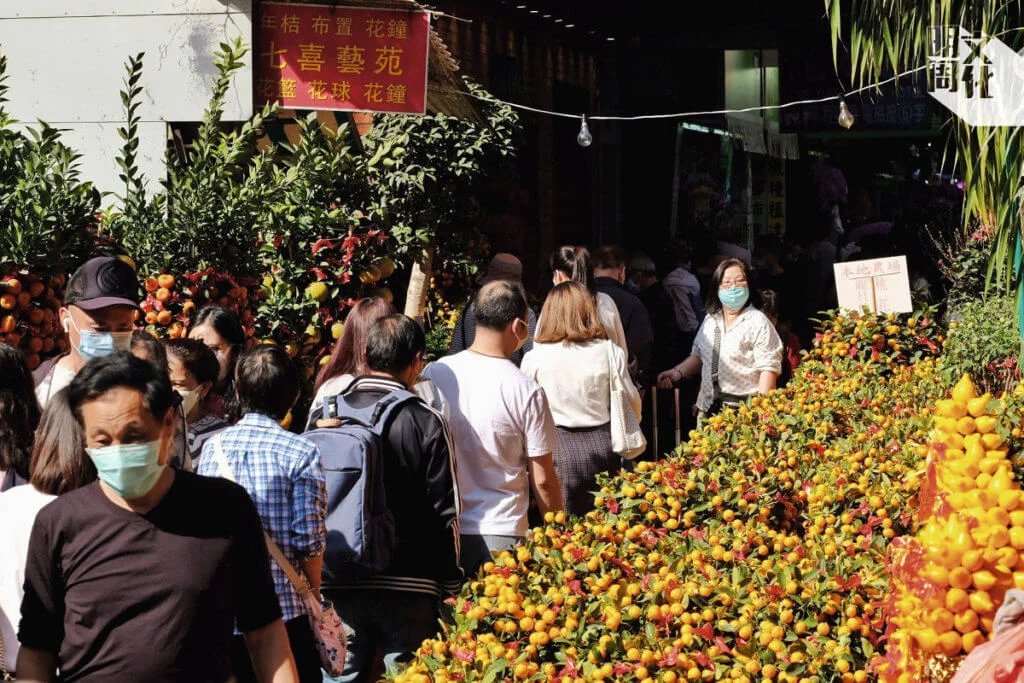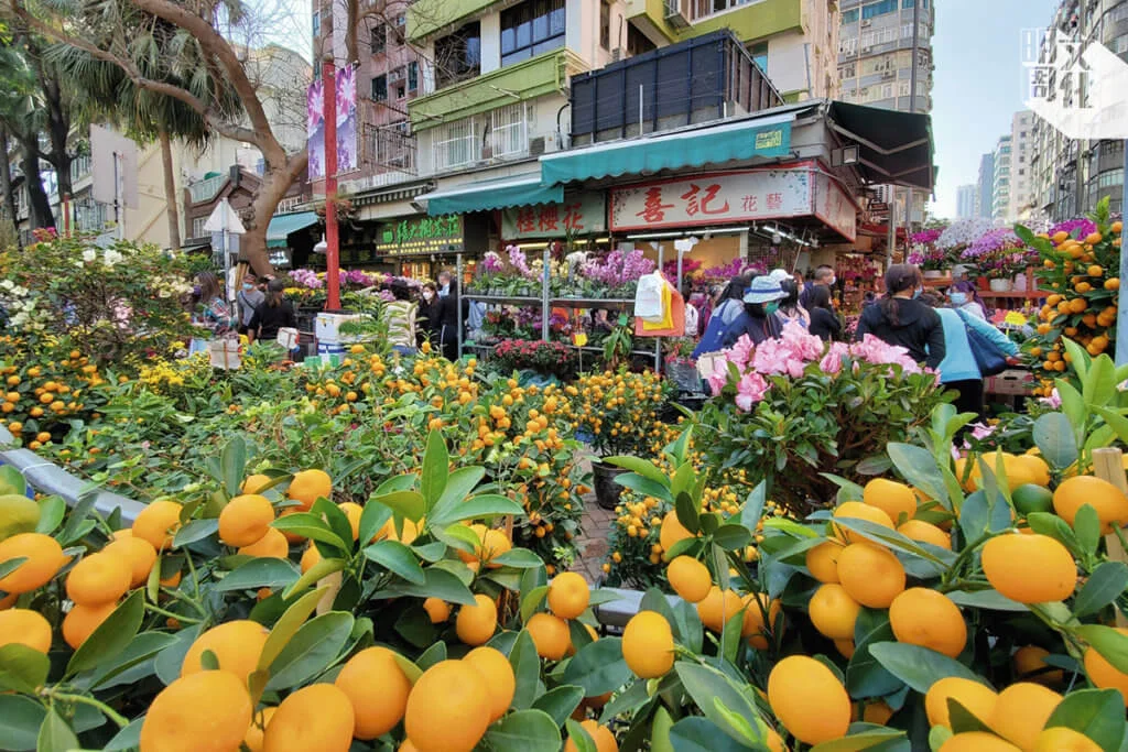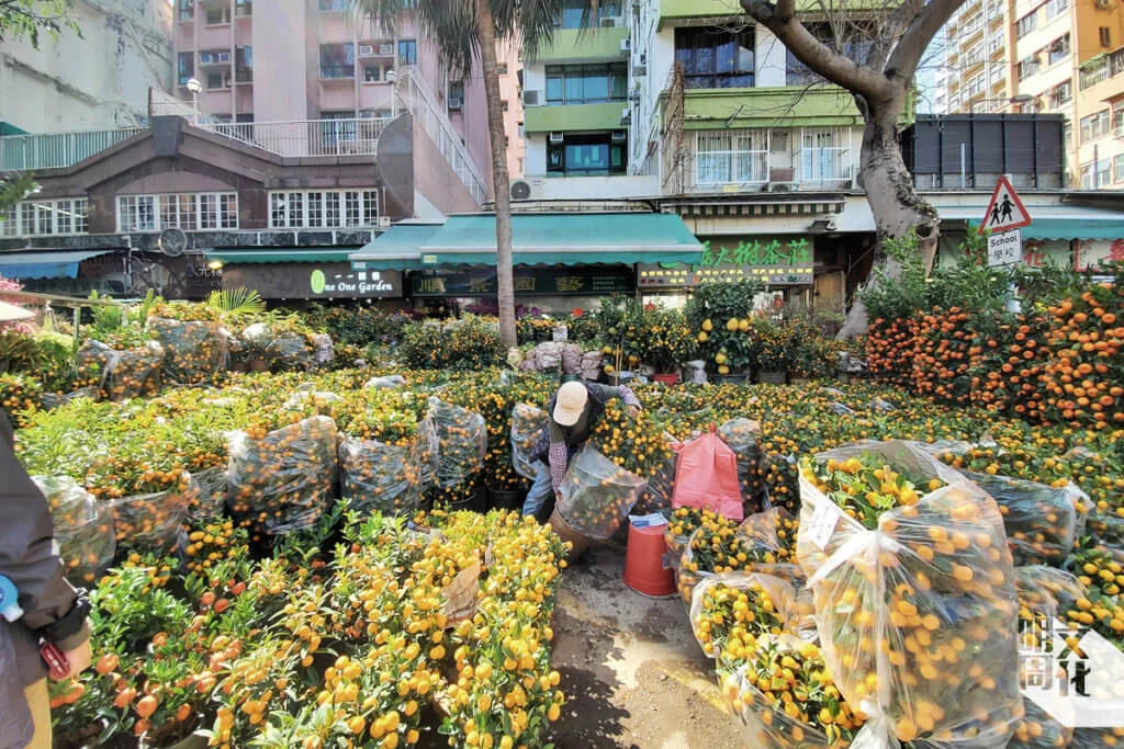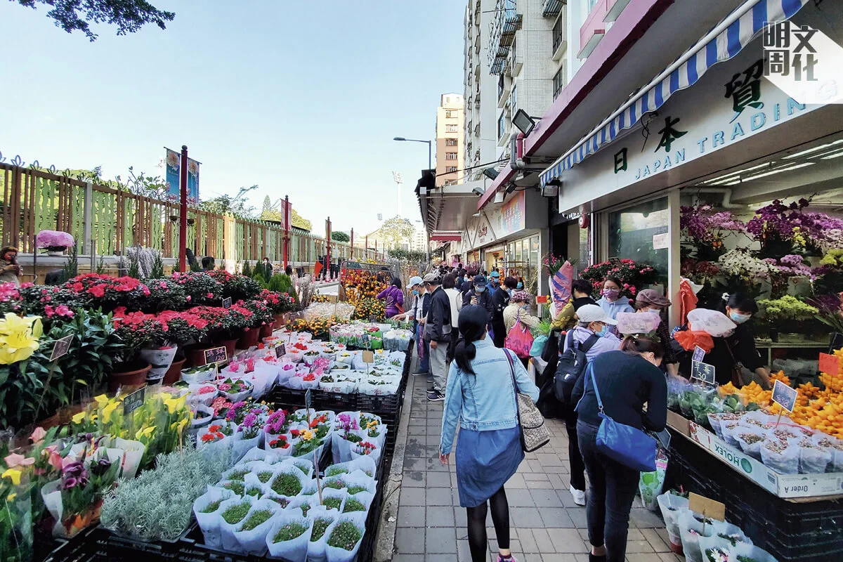 是日花墟人頭頭湧湧,應節年花開得燦爛,如有四季桔、杜鵑、紅掌、富貴子、劍蘭和水仙等,各種植物擺滿行人路或延伸至馬路,不少市民在馬路上選花,也有職員推貨落貨,擠得水洩不通。
