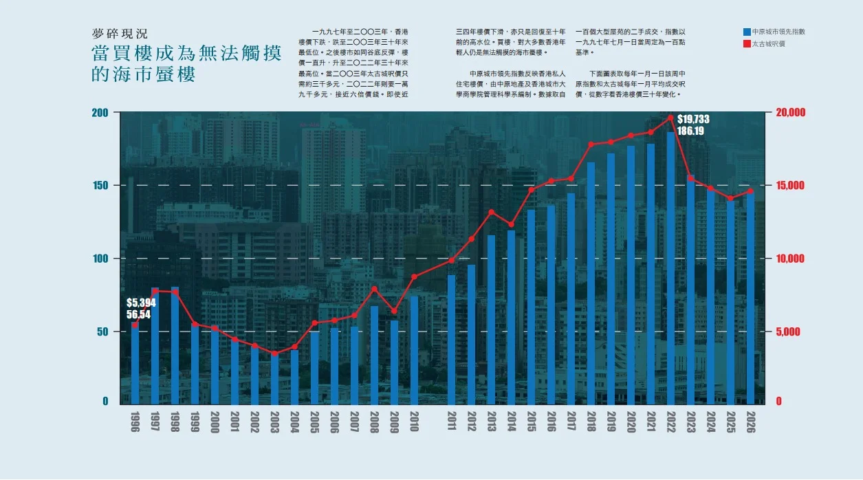 一九九七年至二○○三年,香港樓價下跌,跌至二○○三年三十年來最低位。之後樓市如同谷底反彈,樓價一直升,升至二○二二年三十年來最高位。當二○○三年太古城呎價只需約三千多元,二○二二年則要一萬九千多元,接近六倍價錢。即使近三四年樓價下滑,亦只是回復至十年前的高水位。買樓,對大多數香港年輕人仍是無法觸摸的海市蜃樓。