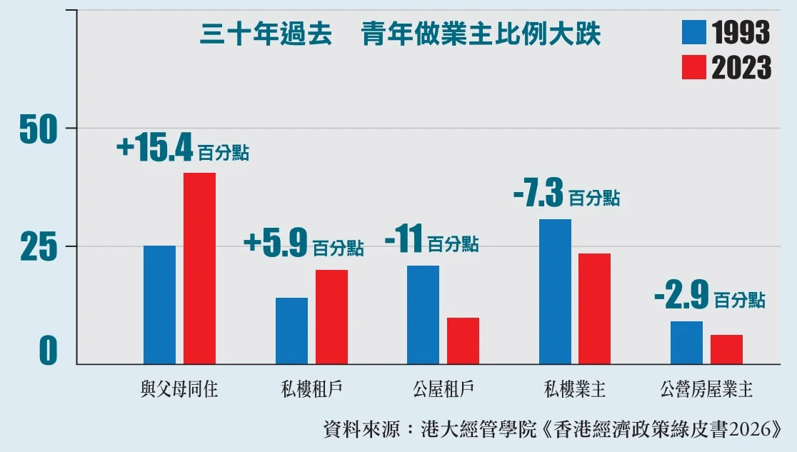 與父母同住成為最多青年的居住模式。二〇二三年,逾四成三十至三十九歲港人與父母同住,比一九九三年增加一成半。即一九九三年每四個人有一個人與父母同住,現在每五個人有兩個「住屋企」。另外,不足三成青年選擇做業主,買公營房屋和私樓的比例均告跌。