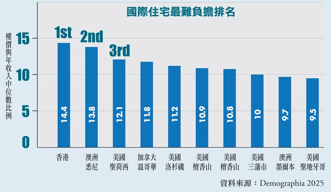 國際公共政策顧問機構Demographia,連續十五年評香港為全球最難負擔樓價的城市。研究取城市住宅樓價中位數和年收入中位數,計算樓價與年收入的比率。比率在三倍或以下屬可負擔,超過五倍屬難以負擔,九倍以上屬無法負擔。香港最新比率是十四點四倍,屬無法負擔,十四點四年不吃不喝才能買樓,領先澳美加城市。