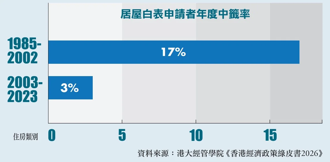 即使公營房屋受資助,購買門檻較低,但仍然困難。香港公私營住宅供應接近分半,然而二〇〇二年起停售居屋,二〇一四年才重新接受居屋申請,港大團隊發現,二〇〇三至二〇二三年非公屋住戶的居屋白表申請中籤率只有3%。