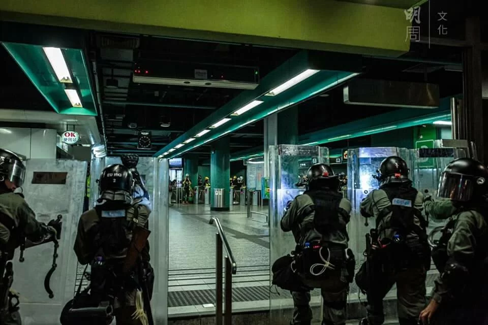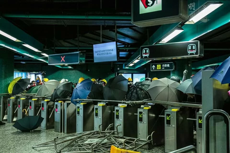 晚上10時左右,警方封鎖鰂魚涌地鐵站太古坊出口,示威者在閘內打開雨傘設防線,並在入閘機前架設鐵馬,警民對峙。