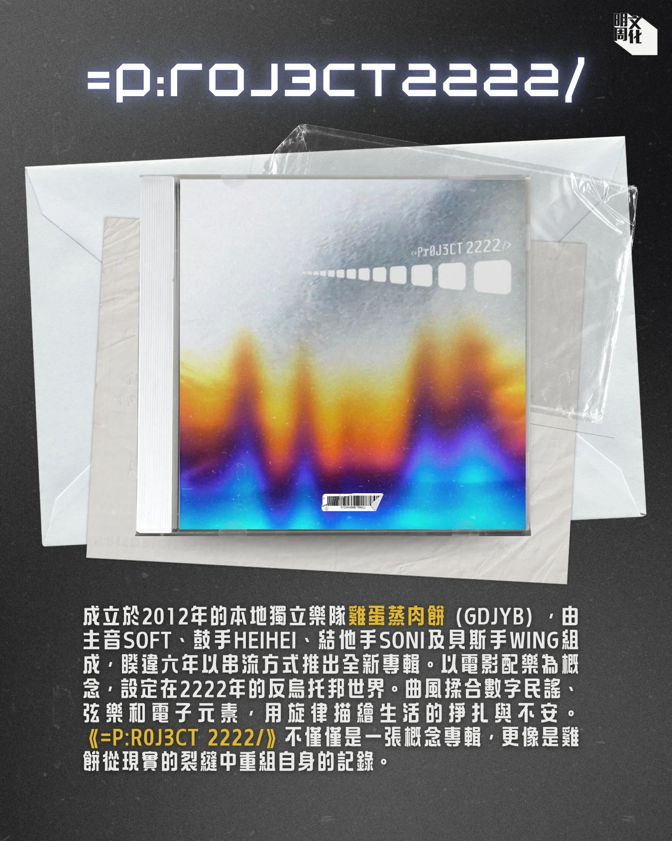 成立於2012年的本地獨立樂隊雞蛋蒸肉餅(GDJYB),由主音Soft、鼓手Heihei、結他手Soni及貝斯手Wing組成,睽違六年以串流方式推出全新專輯。以電影配樂為概念,設定在2222年的反烏托邦世界。曲風揉合數字民謠、弦樂和電子元素,用旋律描繪生活的掙扎與不安。《=P:r0J3CT 2222/》不僅僅是一張概念專輯,更像是雞餅從現實的裂縫中重組自身的記錄。