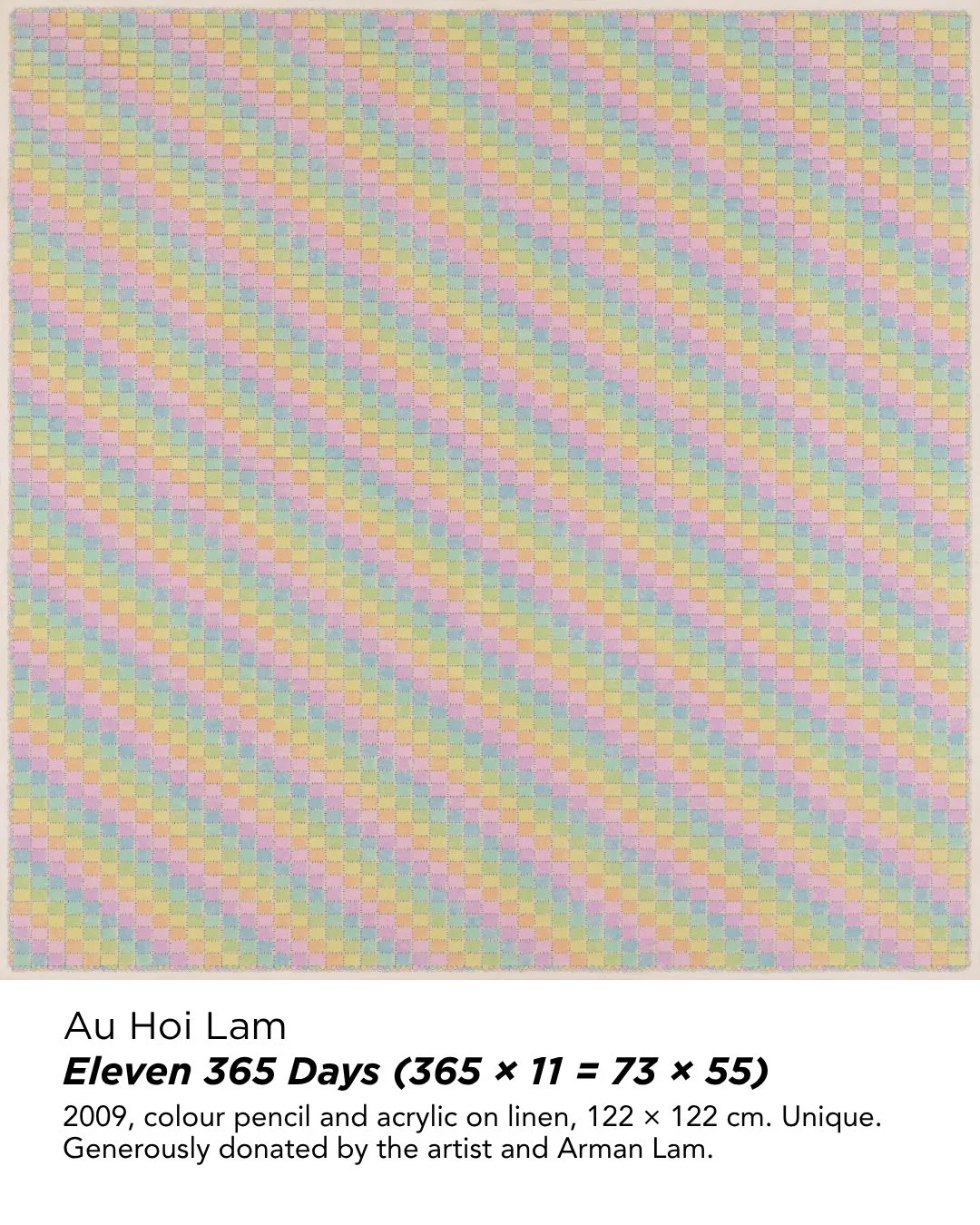 本地動畫家江記的作品《 SPIRITUAL PRACTITIONER 33》 是一件透鏡式燈箱裝置。觀者可以交替看到日本菩薩與骷髏機械人並立的影像,菩薩臉容安祥而平和,機械人則眼神空洞而猙獰。神祇與機器人如同一體兩面的顯化,探討人工智能時代靈性的本質。在急速多變的年代,大眾亦能細味本地藝術家區凱琳以十一年時間,每天填滿一小格的大型畫作 《十一個三百六十五天 (365 x 11 = 73 x 55) 》 (2009)。