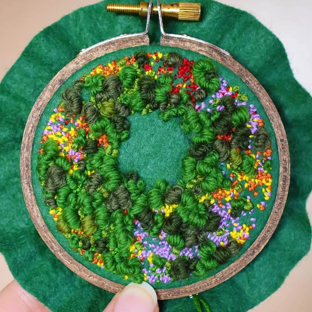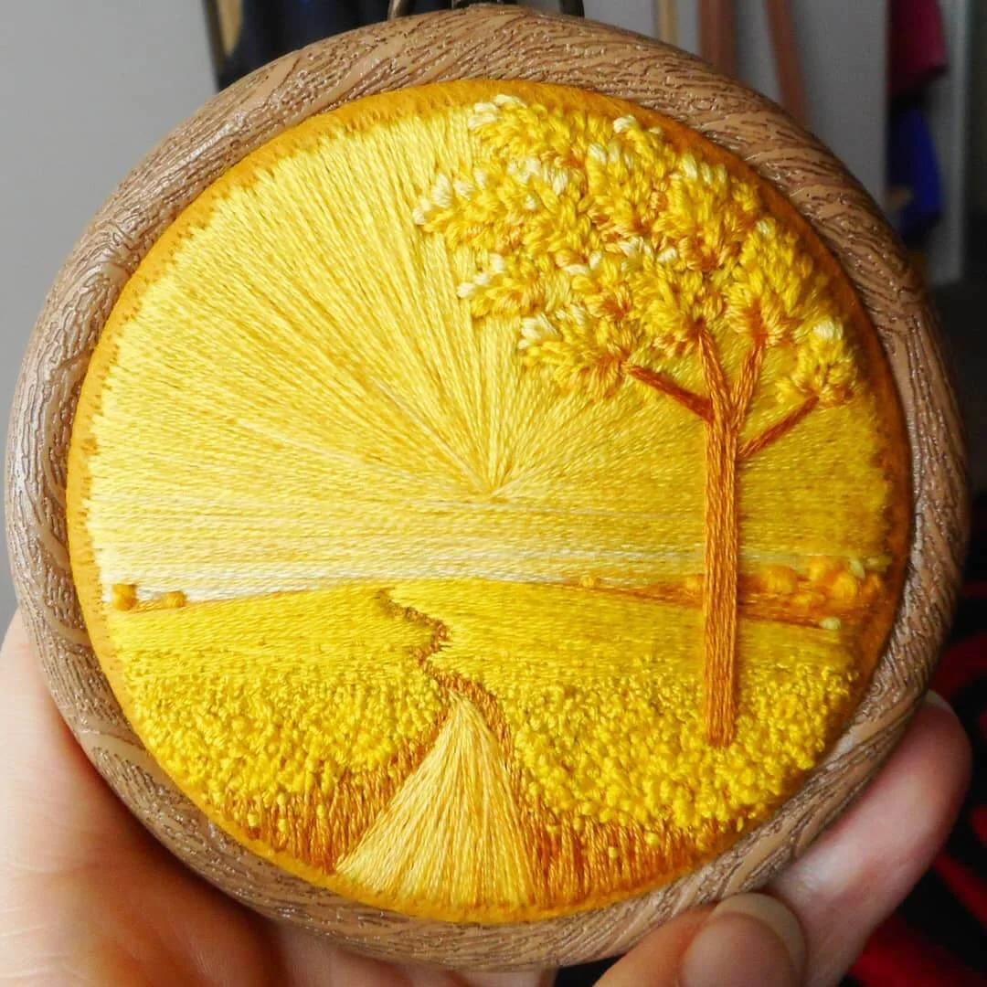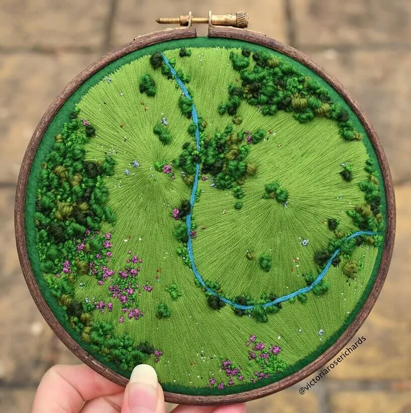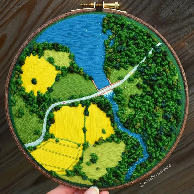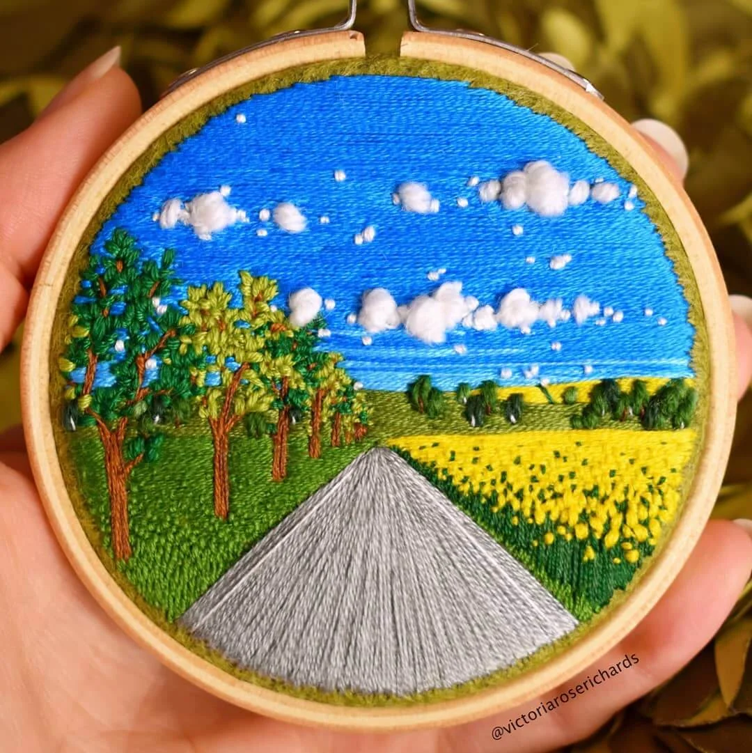 「我嘗試讓每幅作品都與眾不同,並希望人們從中,感受到愛與關懷。」Victoria喜歡選擇明亮的色調,去紀錄療癮人心的風和日麗。畫樹叢,她會利用球狀的法式結粒繡;描摹田地,則以緞面繡或菠蘿花針法。多重技法堆堆疊疊,使她的掌上田園,愈發生機勃勃。
