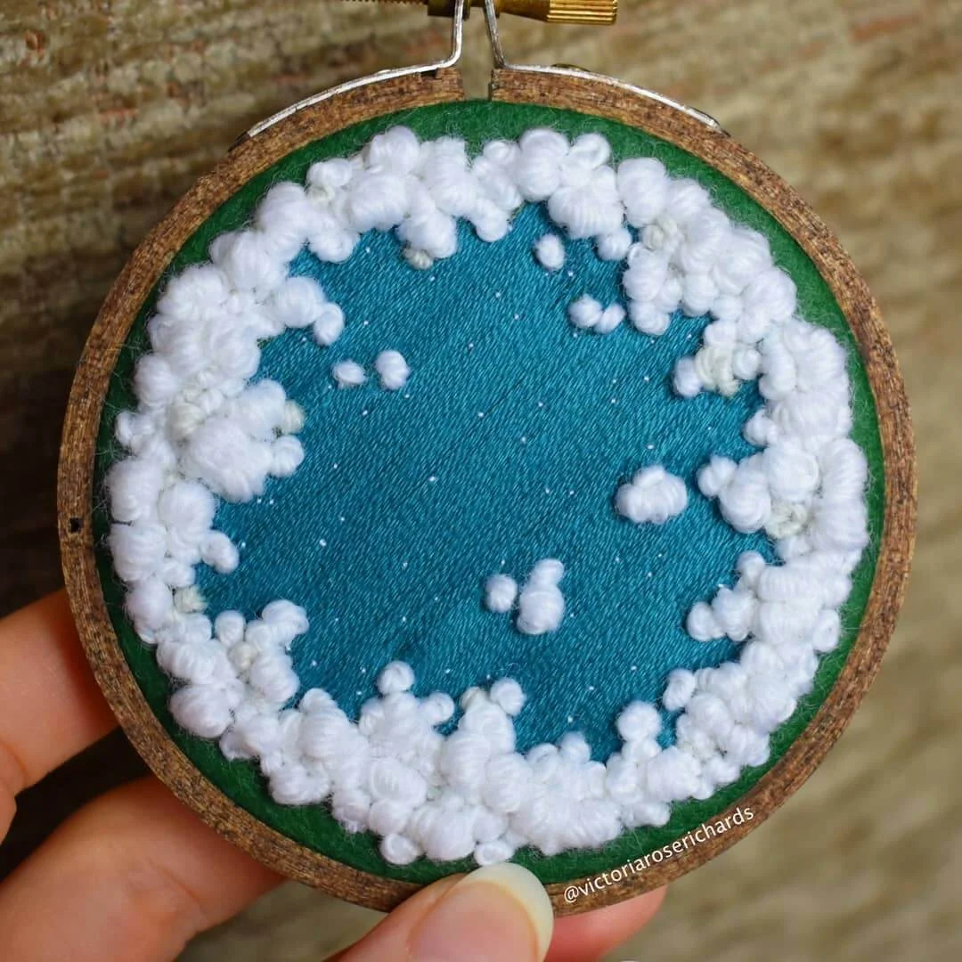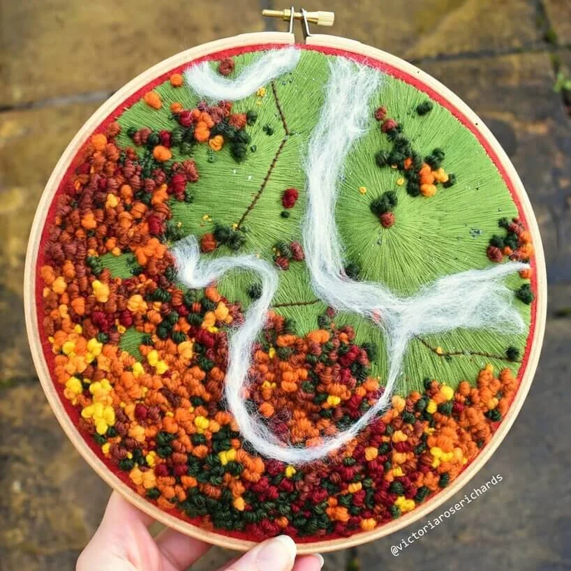 飛過雲的時候,俯瞰會是最棒的療癒活動!特別愛吞下一口雲,再看陸地上小人國一般的樓房與田鄉,以及海面在陽光折射下,波光粼粼。英國藝術家Victoria Rose Richards,就從這種航空角度汲取靈感,用針線縫製出鄉間的四季景致。作品栩栩如生,五顏六色地綻放自然美態,生命力鮮活而燦爛。