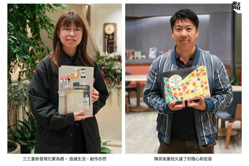 其中兩位青年創作人是從事平面設計工作的三三和陳奕愉,從二○二四年九月起,跟素未謀面、有認知障礙特質的長者各持一本月記,一個月交換一次,成為對方半年的神秘筆友。長者是甚麼年紀、背景如何、狀況怎樣,全不知情。三三打趣地說:「就像未拍拖就結婚,還要『Long D』!」