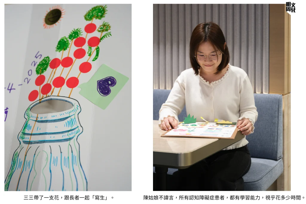 三三笑說,她的筆友跟自己的想像,多少有些差異,「但她穿了一件有花朵圖案的衣服。」她眼中的這位長者,很有活力,「但會經常講『對不起』,覺得自己很沒用。」三三帶了一支花,跟對方一起「寫生」,每當長者覺得猶豫、不安的時候,她便稍作停頓,轉移焦點,作出引導,「她愈來愈有信心,甚至主動提出要把某些顏色填滿。」完成後,她問三三,可不可以把花拿走,給女兒看看,「當然可以啦,我本來就是要送給她。」