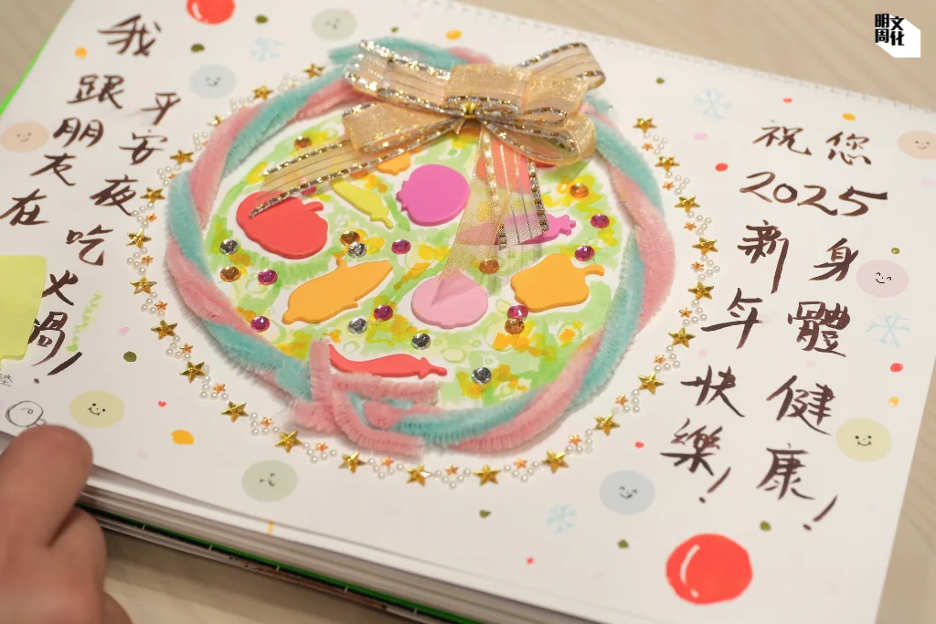 陳奕愉則畫了一個握手的畫面,「就像真實見面時會做的事情。不只寫上『你好』。」去了沖繩旅行的他,又製作了一個海底世界,更設計一條會動的「魔鬼魚」,讓長者互動。他也善用Bling Bling貼紙、彩麗皮(EVA海綿紙),盼以不同質料刺激對方。他又畫了平安夜吃火鍋的情景,想不到長者隨後也畫出吃火鍋的畫面,「終於咬到『牙』(呀)!」