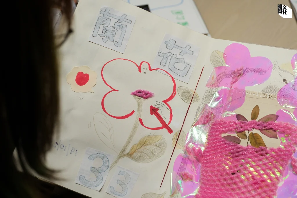 至於三三的筆友,筆觸輕而短,以線條為主,喜歡用貼紙,但很克制,布局整齊而平衡,繪畫元素似乎跟大自然有聯繫,愛畫太陽、小鳥,外形獨特的蝴蝶反覆出現,「她的生活,會不會跟大自然有關?」三三後來也分享了花、樹、山,把語言簡化,「不說別的了,就專注上一篇月記出現過的關聯。」她有次去了鴨洲,看到很多地質、大自然的景致,便把遊記,結合對方可能有感覺的元素,「試試這樣創作月記!」她繼續精心製作,讓筆友摸摸揭揭、找些東西,「只要他們樂在其中,別為他們以至工作人員添煩惱便好。」「Long D」得來,「開始有感情了!」