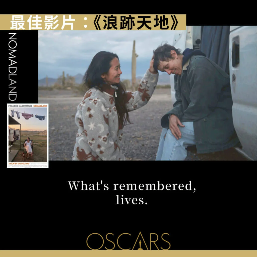 2021年奧斯卡金像獎頒獎典禮於香港時間今早舉行。疫情下,典禮以現場混合網絡形式頒獎,創下多項紀錄。今屆奧斯卡大贏家為亞裔趙婷導演的《浪跡天地》,奪得最佳影片,導演本人奪最佳導演,而其主演法蘭絲麥杜曼(Frances McDormand)亦第三度贏得最佳女主角獎。最佳男主角由《爸爸可否不要老》(Father)的主角安東尼鶴健士(Anthony Hopkins )贏得,這是他第二次獲頒該獎,是該獎項最老的得獎者。
