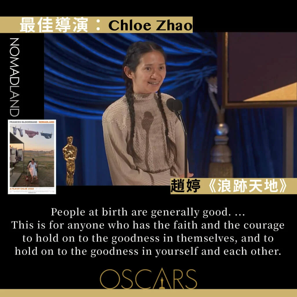憑《浪跡天地》獲得最佳導演的趙婷,是首位亞裔女性獲得此項殊榮,而《浪》亦再下一城奪最佳影片。她在致辭中說道,「這個獎是屬於所有無論有多困難,都依然秉持信念和勇氣堅持行善、彼此保持良善的人。」而憑《浪》中精湛演出第三度奪得最佳女主角獎的法蘭絲麥杜曼只簡短道謝,表示熱愛演藝工作。