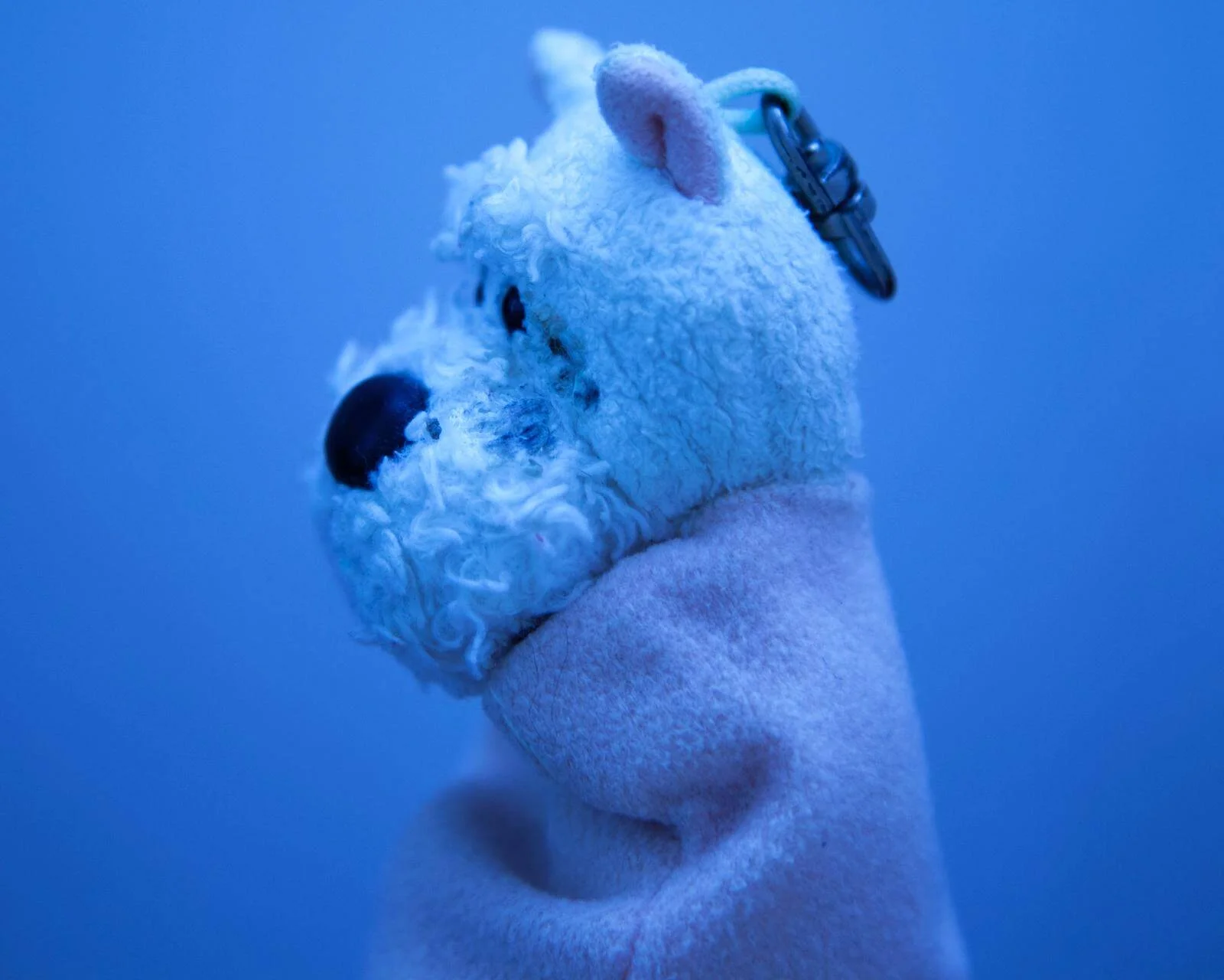 她在展覧場地,緩緩向記者訴說照片背後的故事⋯⋯照片中的狗玩偶於她別具意義,她說媽媽並非典型的那類,不會煮飯也不常在家。因此當她小六收到媽媽送的玩偶,特別珍而重之,至今依然每晚要抱着方能入睡。她憶起小時媽媽氣了她,總會拿着玩偶代替自己道歉。玩偶成了年幼時她與媽媽疏遠關係間,一道小小的橋樑。