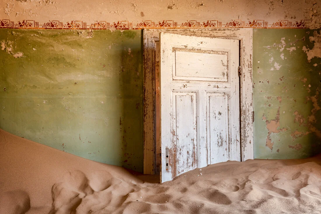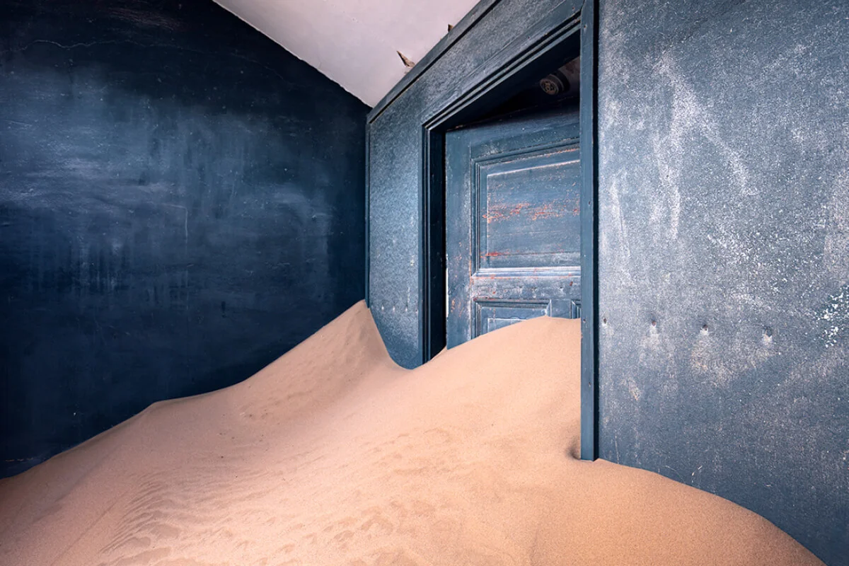 James Kerwin首個取景地,是有鬼城之稱的Kolmanskop(卡曼斯科位於納米比亞)。這個沙漠小鎮曾經繁華,盛產鑽石;第一次世界大戰後,鑽石價格大幅下跌,城鎮逐漸荒廢,滾滾黃沙把前塵舊事盡數掩埋。2019年2月,Kerwin耗了整整四天,捕捉暖陽潛入殞落房子,跌碎一地寂寂光華之靜默美。