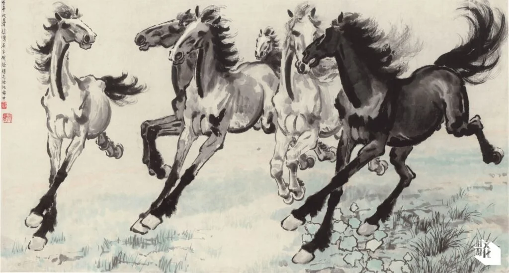 徐悲鴻(一八九五至一九五三年)為二十世紀中國最具影響力的藝術家,被公認為「水墨大師」。出生於江蘇貧窮家庭,爸爸亦是位畫家,在一九一九年獲官費獎學金到法國留學。他的作品以奔馬題材著稱,運用寫實手法革新傳統水墨畫。他筆下駿馬形神兼備、氣勢磅礴。