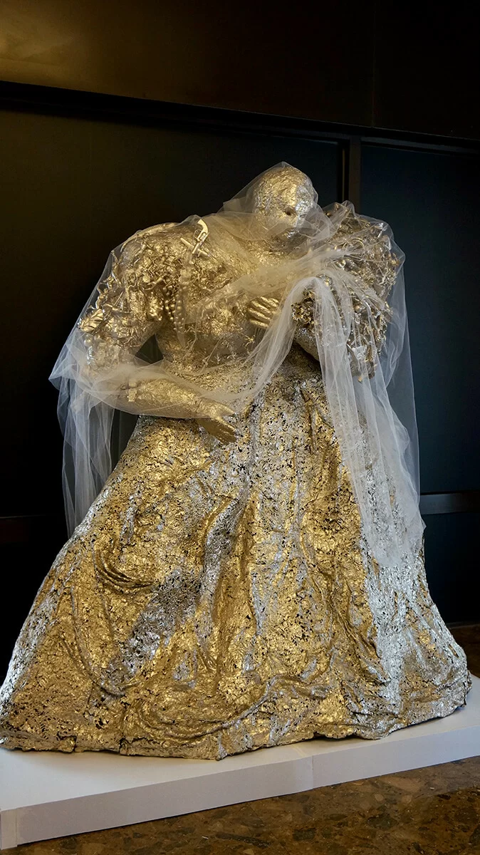 此外,她亦藉創作表達對女性的壓迫,龐比度中心展出她在1963年創作的雕像《Eva Maria》,新娘穿上灰白婚紗,臉上絲毫沒有快樂,身上貼滿塑膠人偶、動物玩具、花卉,「跟很多家境富裕的年輕人一樣,我的成長只為婚姻市場而設,結婚就是主流!所有我這一代的女子長大都只為結婚。」她嚴厲地道出對家庭的控訴。
